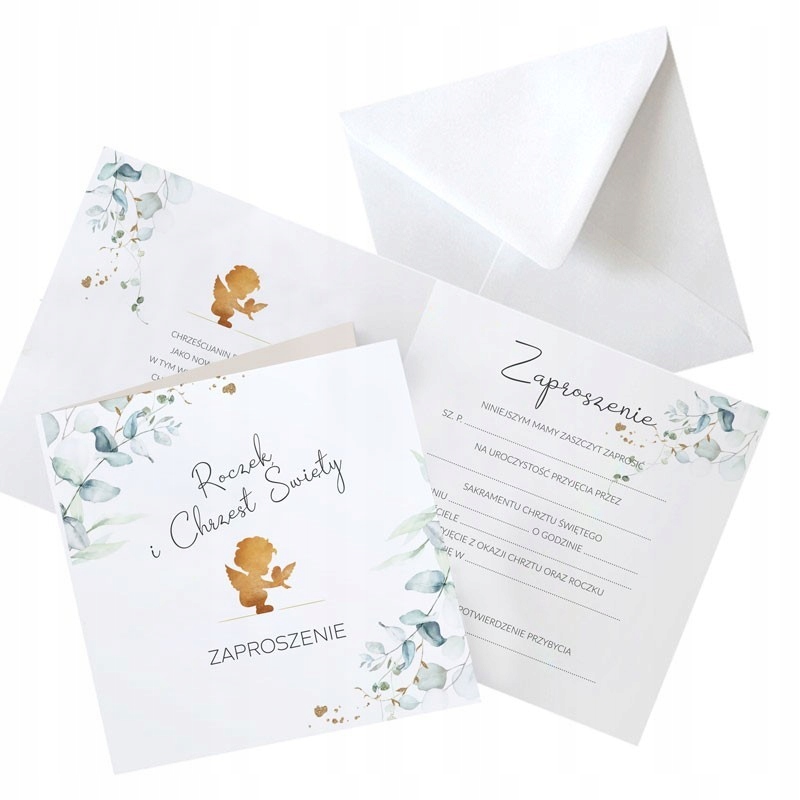 - состав: крещение и годовалые приглашения написать самому, с изображением ветвей эвкалипта и золотого ангела (10 штук) и белого конверта.