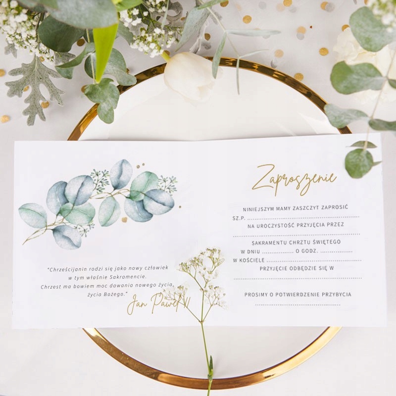 - Внутри приглашенияветочка эвкалипта графика, текст для заполнения и цитата из Иоанна Павла II: «Христианин рождается человеком в этом самом Таинстве. Крещение имеет силу дать новую жизнь, жизнь Божию».