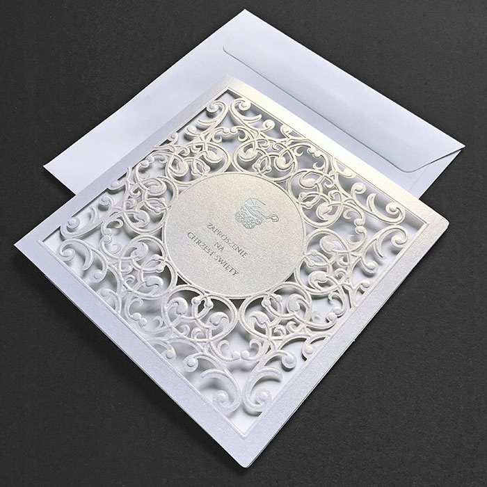 Обложка украшена ажурным мотивом, выполненным методом лазерной резки и тиснения. В центральной части изящное посеребрение в виде тележки и надпись «Приглашение на Святое Крещение».