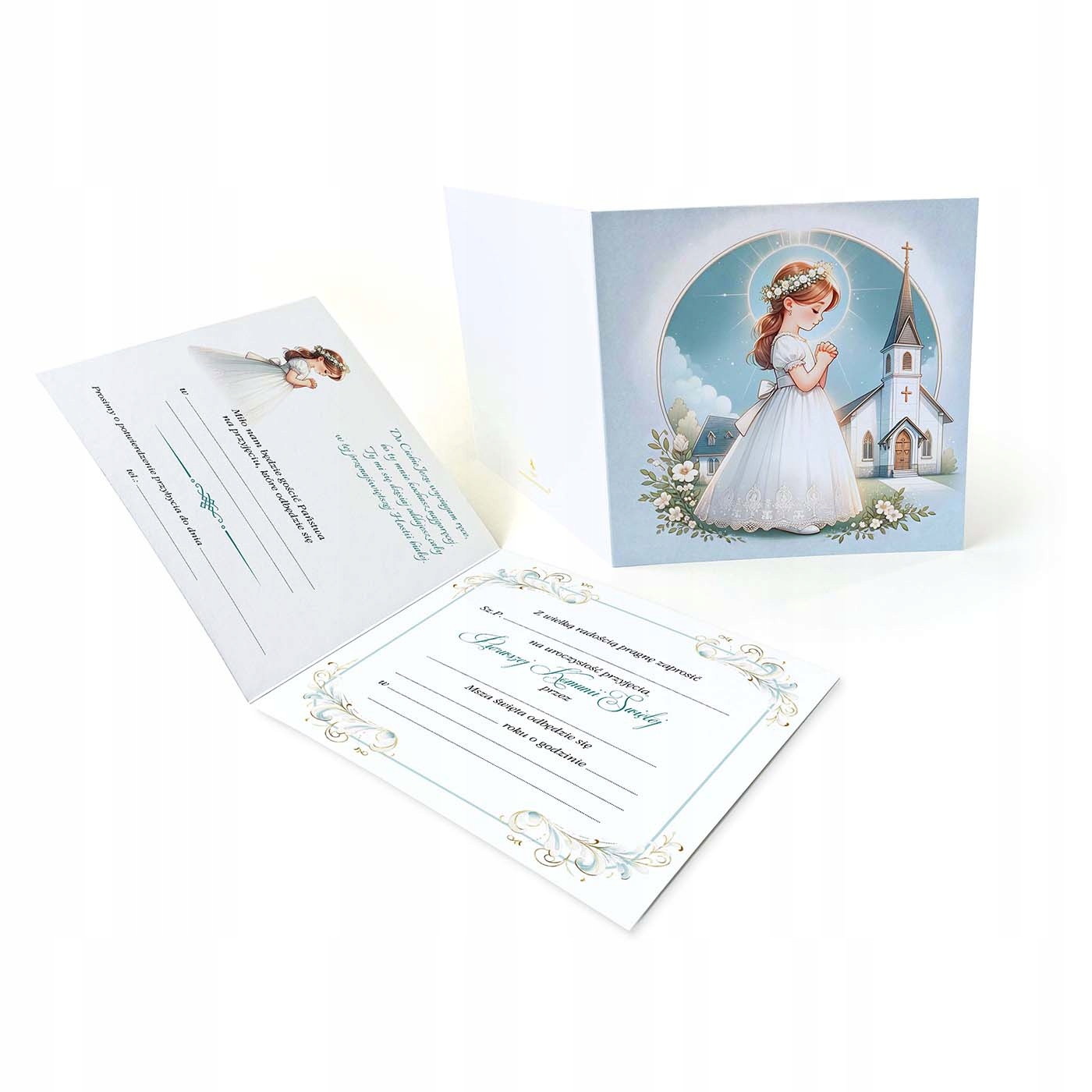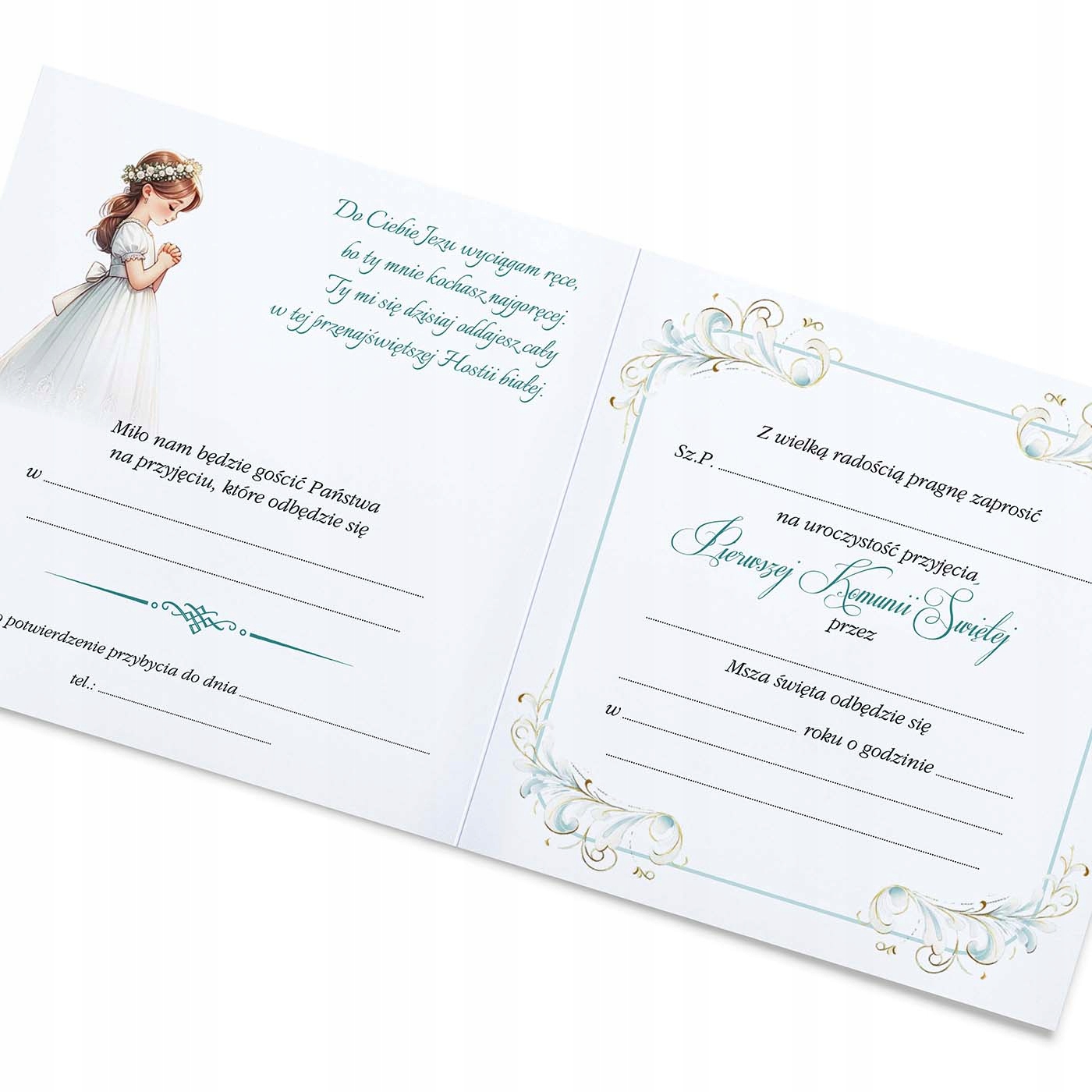 Приглашение к Первому Причастию для девушки, изготовлено из немелованной, не содержащей древесины бумаги премиум-класса с высоким коэффициентом белизны, обеспечивающей отличное покрытие и контрастность текста и графики.