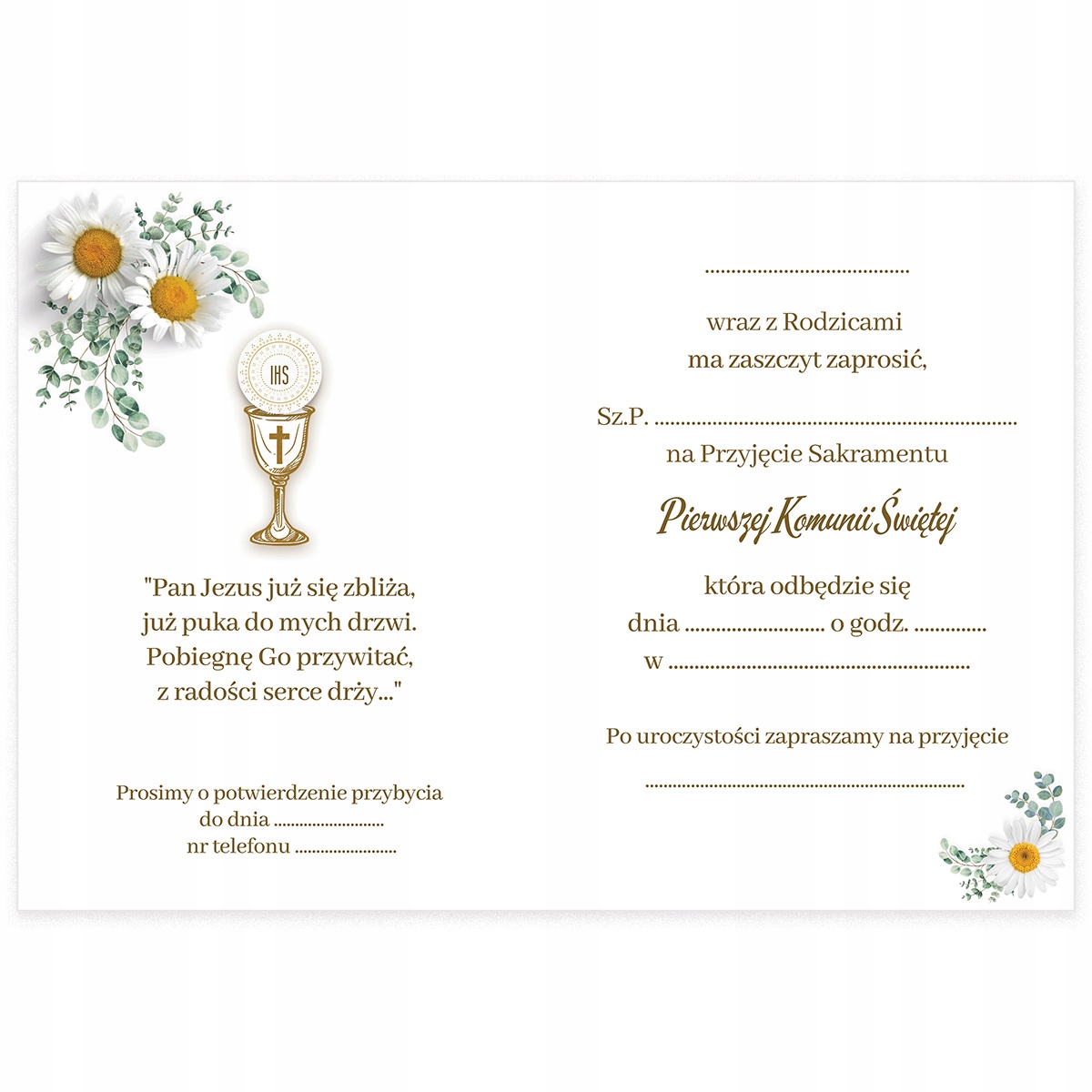 Пригласительные в белом, золотом и зеленом цветах. Внешняя часть приглашения имеет белый фон, в центре расположен крупный хост с золотым кругом и надписью «IHS». Все это украшено зелеными ветвями и цветами ромашки. Над чашей изящная рамка с надписью «Приглашение к Первому Причастию». Внутри приглашения, с левой стороны, чаша с хозяином, стихотворением и информацией о подтверждении прибытия. С правой стороны есть место для заполнения всей необходимой информации. Весь интерьер украшен мотивами ромашек и нежных листьев.