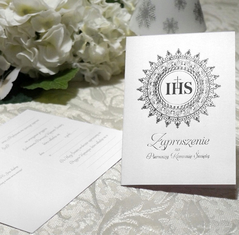 ПРИГЛАШЕНИЕ НА ПЕРВОЕ СВЯТОЕ ПРИЧАСТИЕ С СЕРЕБРЯНЫМ МЕТАЛЛИЧЕСКИМ ОРНАМЕНТОМ И БЕЛЫМ КОНВЕРТОМ.