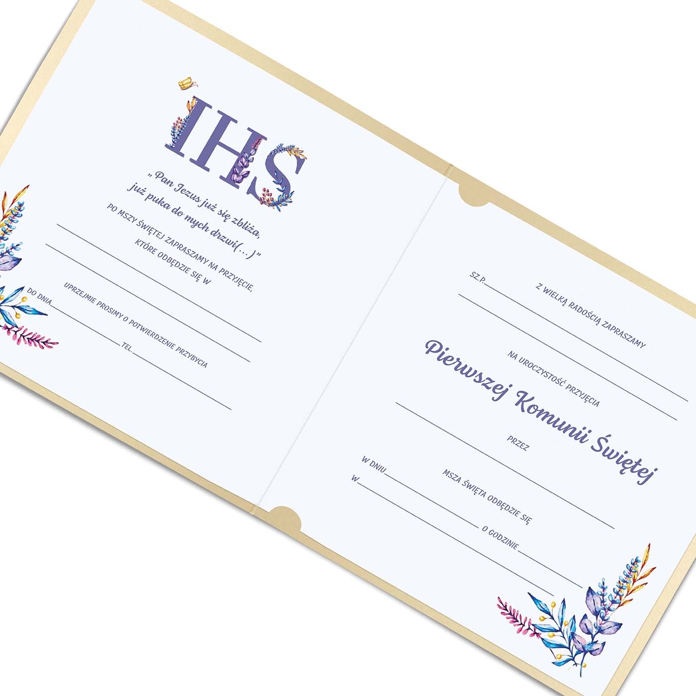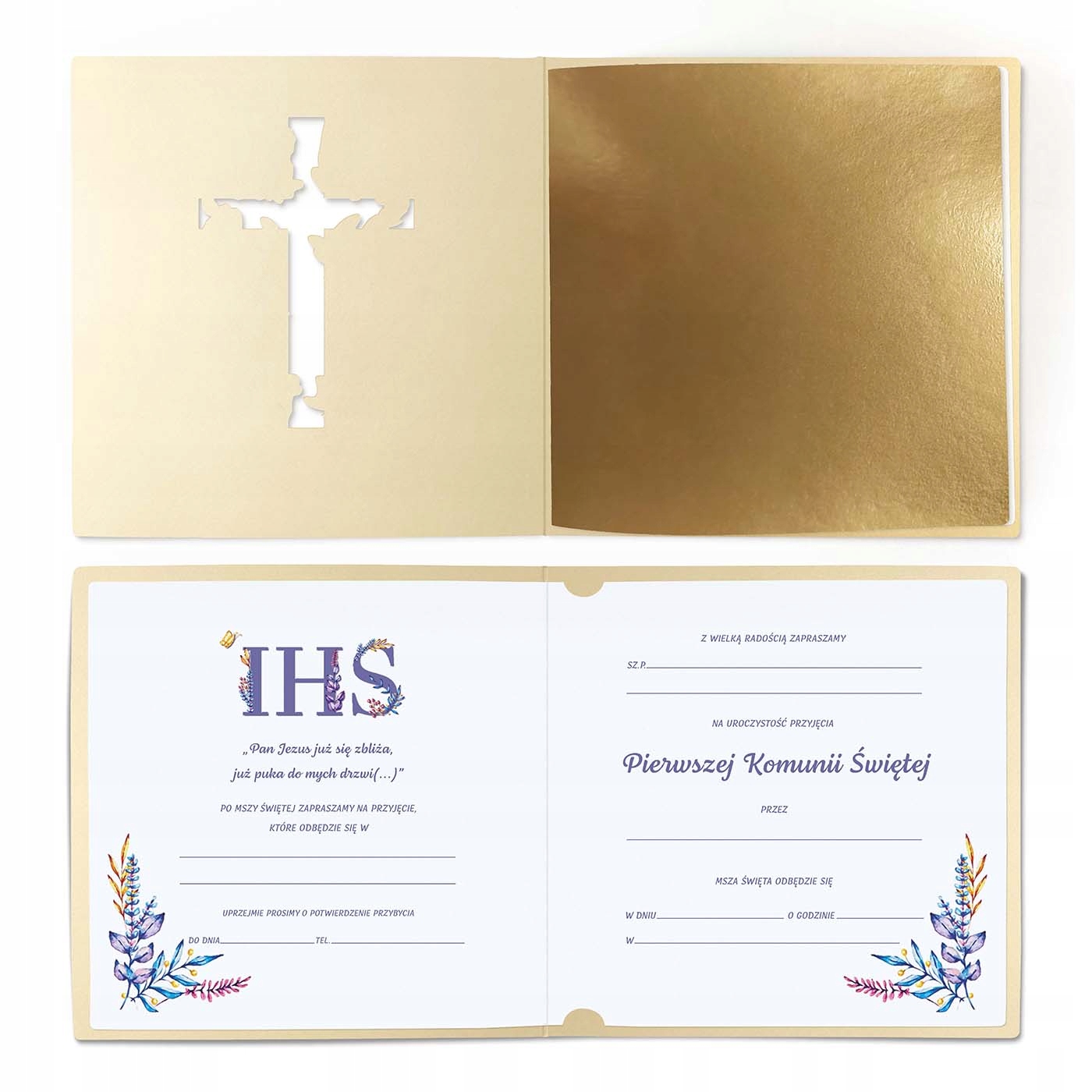 Приглашение на Святое Причастие из высококачественной металлизированной бумаги цвета экрю с декоративным крестообразным узором, выполненным методом лазерной резки, цветное. печать и изысканность в виде тонкого золочения. Вкладыш с печатным текстом для написания от руки. Приглашение в самых модных цветах этого сезона, выполненное с большой тщательностью и вниманием к деталям. Точная печать, точность исполнения и качественная бумага.
