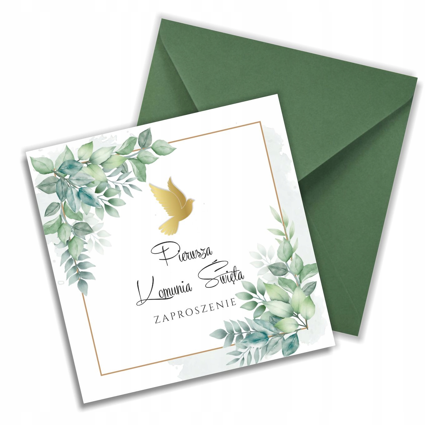 Приглашение к первому Святому Причастию. с мотивом зеленых листьев, выполненным на плотной атласной бумаге. Приглашение предназначено для того, чтобы вы завершили свою работу. Кроме того, к приглашению прилагается белый конверт.