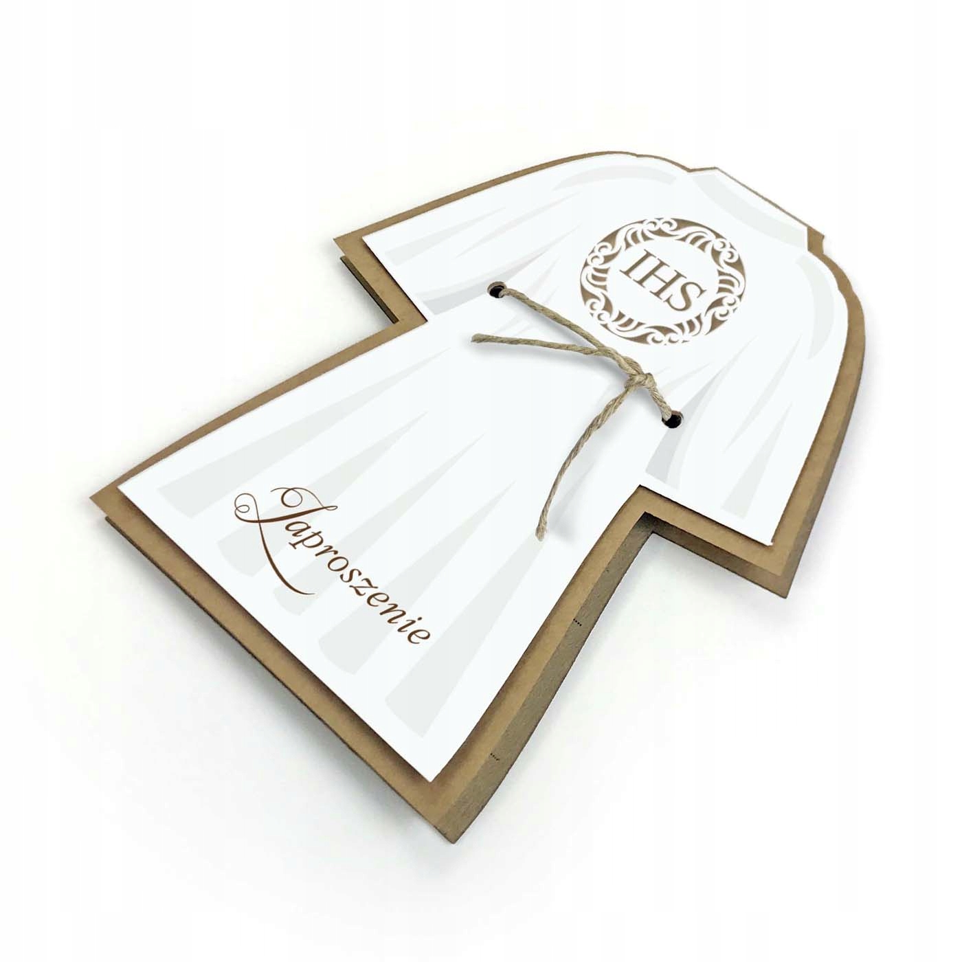 Приглашение в виде наряда для причастия - альба, выполненное из сертифицированной, экологической, плотной бумаги с белой аппликацией, привязанной к обложке веревочкой.