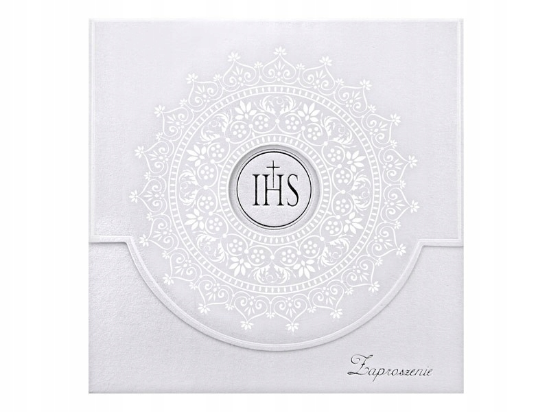 Приглашение к причастию выполнено на высококачественной перламутровой бумаге с красивым тиснением в виде белого орнамента и серебряных надписей. В верхней части приглашения вырезается кружок, под которым видна надпись «IHS».
