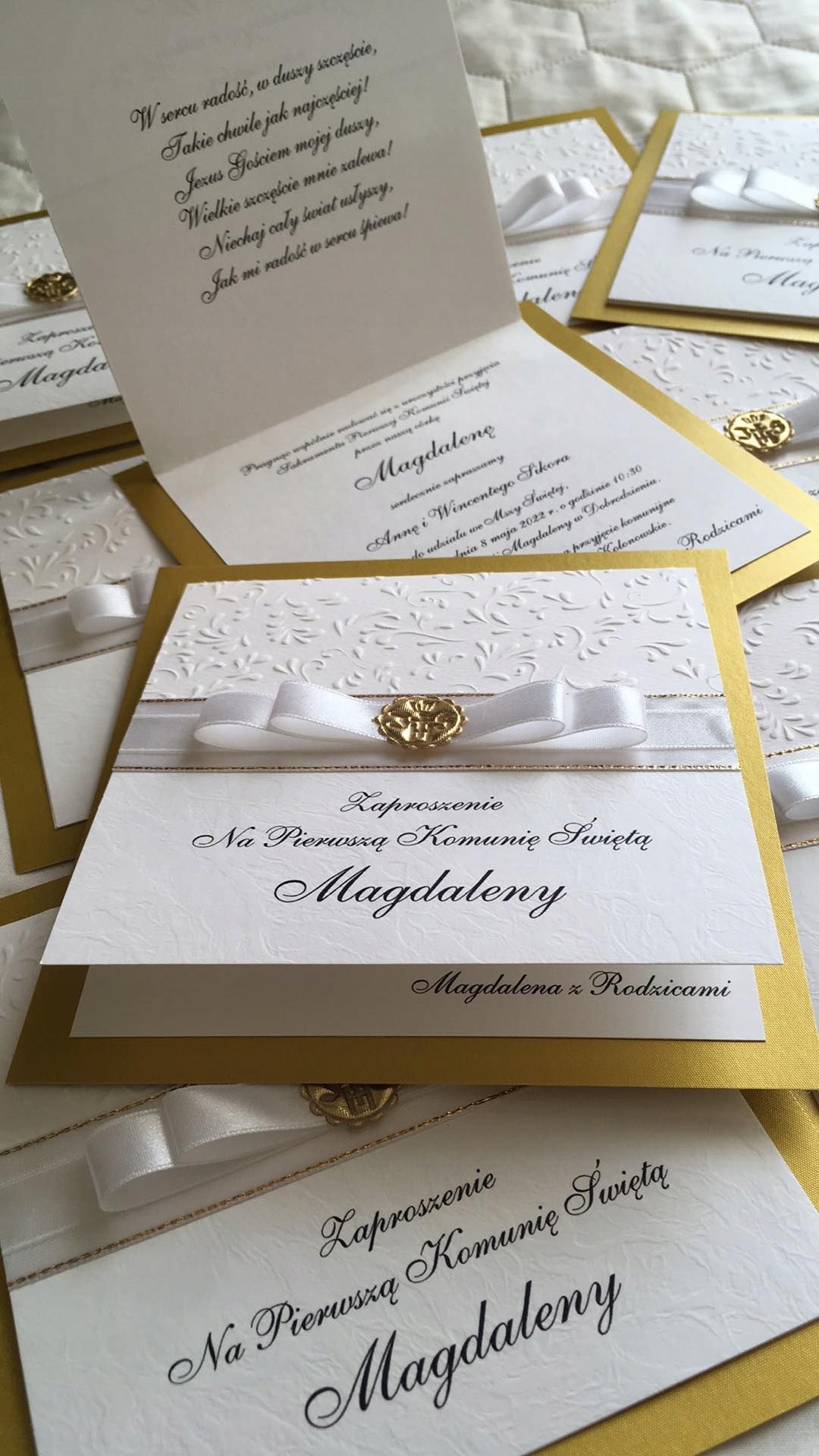 Приглашение представляет собой сочетание золотого и белого картона. Вся вещь украшена слегка блестящим белым бантом и эмблемой IHS.