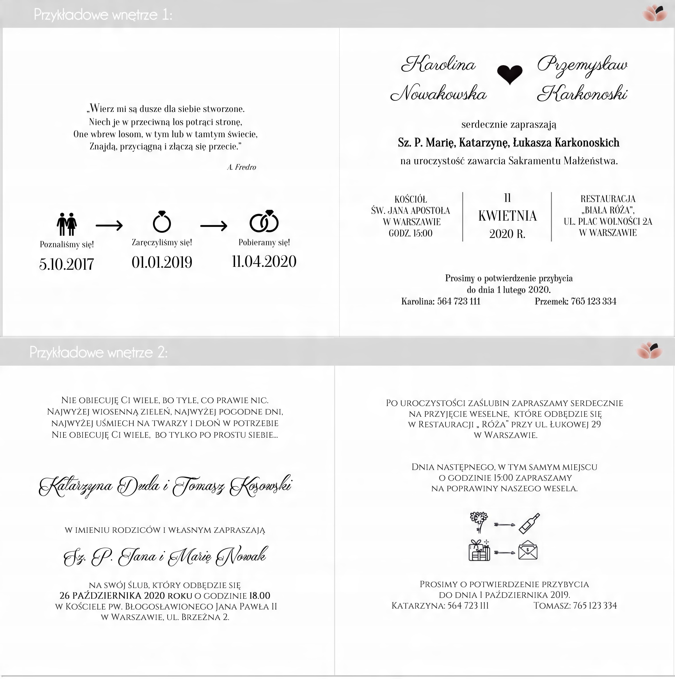 Как сделать покупку? Мы делаем бесплатный дизайн при заказе выше заказа 10 штук. Мы рассматриваем заказ ниже этого количества как образцы. Вы можете купить проект, тогда количество не имеет значения. Содержимое содержания или уведомления приглашения, шрифтов, форма заказа, которая должна быть заполнена, в соответствии с инструкциями. Это очень просто и приятно! :) Мы делаем заказы, объединенные как часть одной покупки. Например, вы покупаете 70 штук, из которых 60 предназначено для свадьбы и свадьбы и 10 для самой свадьбы. Бесплатно мы выполняем второй проект 1-4 рабочих дня вы получите вас на графическом дизайне по электронной почте, его следует проверить очень тщательно, отправить какие-либо изменения (например, шрифт оказался не таким, поэтому вы можете изменить его на другой, на данном этапе) или Отправьте утверждение проекта, если все последовательно и принято. Список гостей можно отправить при принятии проекта. Заказ обычно выполняется примерно через 2-5 дней, одобрение или оплата, зависит от того, какая деятельность была последней. Мы оставляем время на до 14 рабочих дней в случае большого количества заказов или отсутствия материалов. Выбранные приглашения - до 10 штук. Средства отправляются случайным образом. Мы не делаем проект здесь. Образцы до 3 штук по почте 8.90. Образцы выполняются по порядку, как и основные заказы. Мы распределяем все заказы. Я плачу за заказ? Также можно доставить доставку. Как его отправить? Список гостей можно отправить как 1. Приложение в ранее подготовленном файле, например Свадьба и сама свадьба. Зависит от того, насколько это удобнее, пожалуйста, выберите правильную форму для себя. Список гостей можно отправить после утверждения проекта. Порядок может быть комбинирован, но он не должен - например, 70 приглашений на свадьбу и прием и 5 только для свадьбы. Затем вы получаете 2 проекта приглашения. Важно, чтобы общая сумма превышала 10 штук :) Никаких дополнительных сборов здесь не взимается. Форма заказа имеет место для всех данных и комментариев. Пожалуйста, отправьте информацию последовательно в одном сообщении, если возможно :)