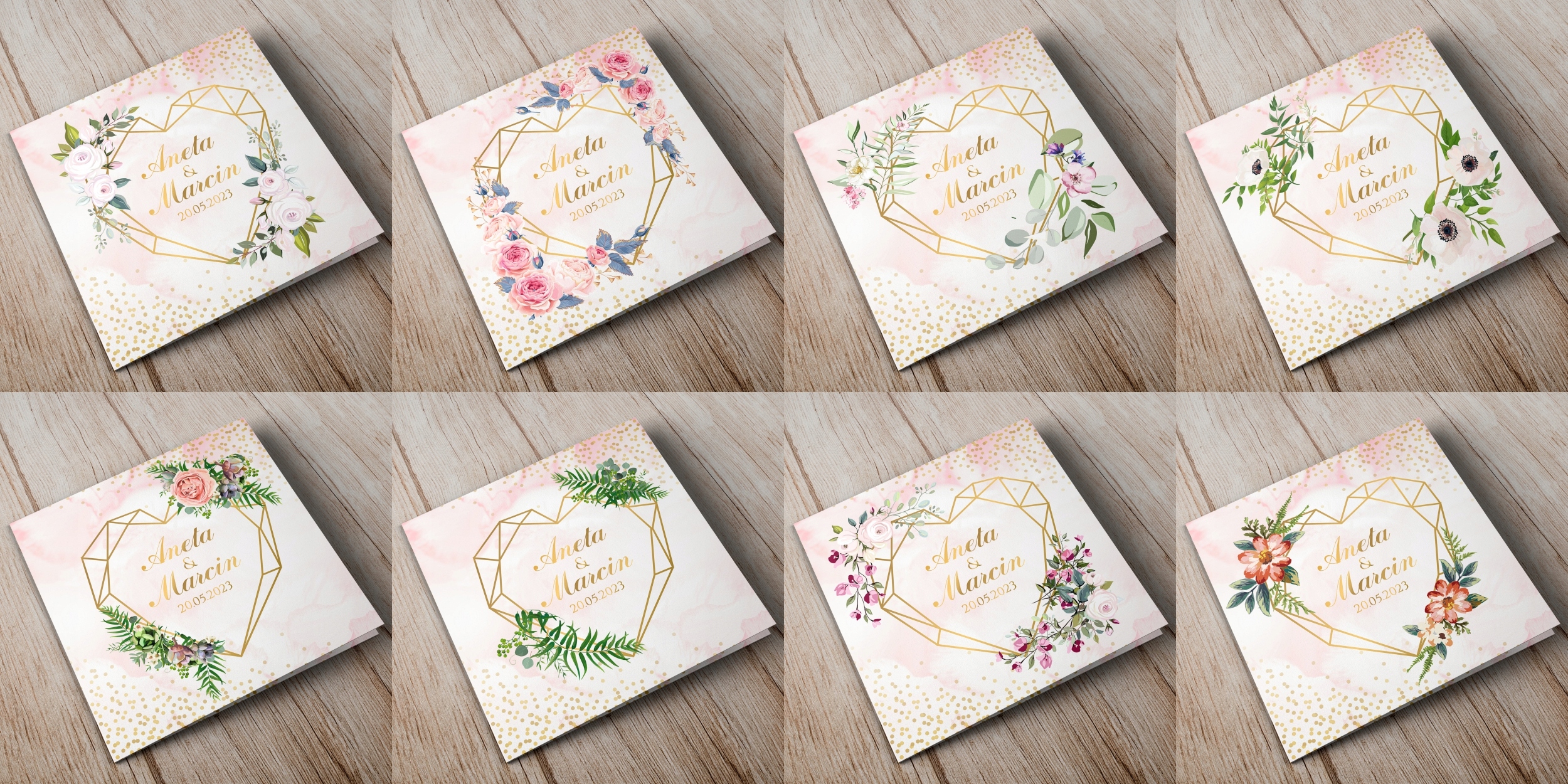 Приглашения на свадьбу из коллекции Geometric Heart с красивыми цветочными композициями и геометрической формой сердца. Мы печатаем свадебные приглашения только на основе наших графических шаблонов, доступных в визуализациях ниже. Невозможно изменить цвета графических рисунков и шрифтов. Меняется только текст персонализации. Тексты можно свободно редактировать или удалять. Приглашения на свадьбу распечатываются в полноцветном режиме.