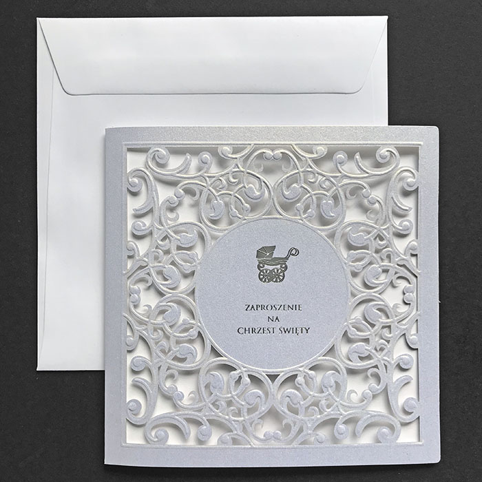 Обложка украшена ажурным мотивом, выполненным методом лазерной резки и тиснения. В центральной части изящное посеребрение в виде коляски и надпись «Приглашение на Святое Крещение».