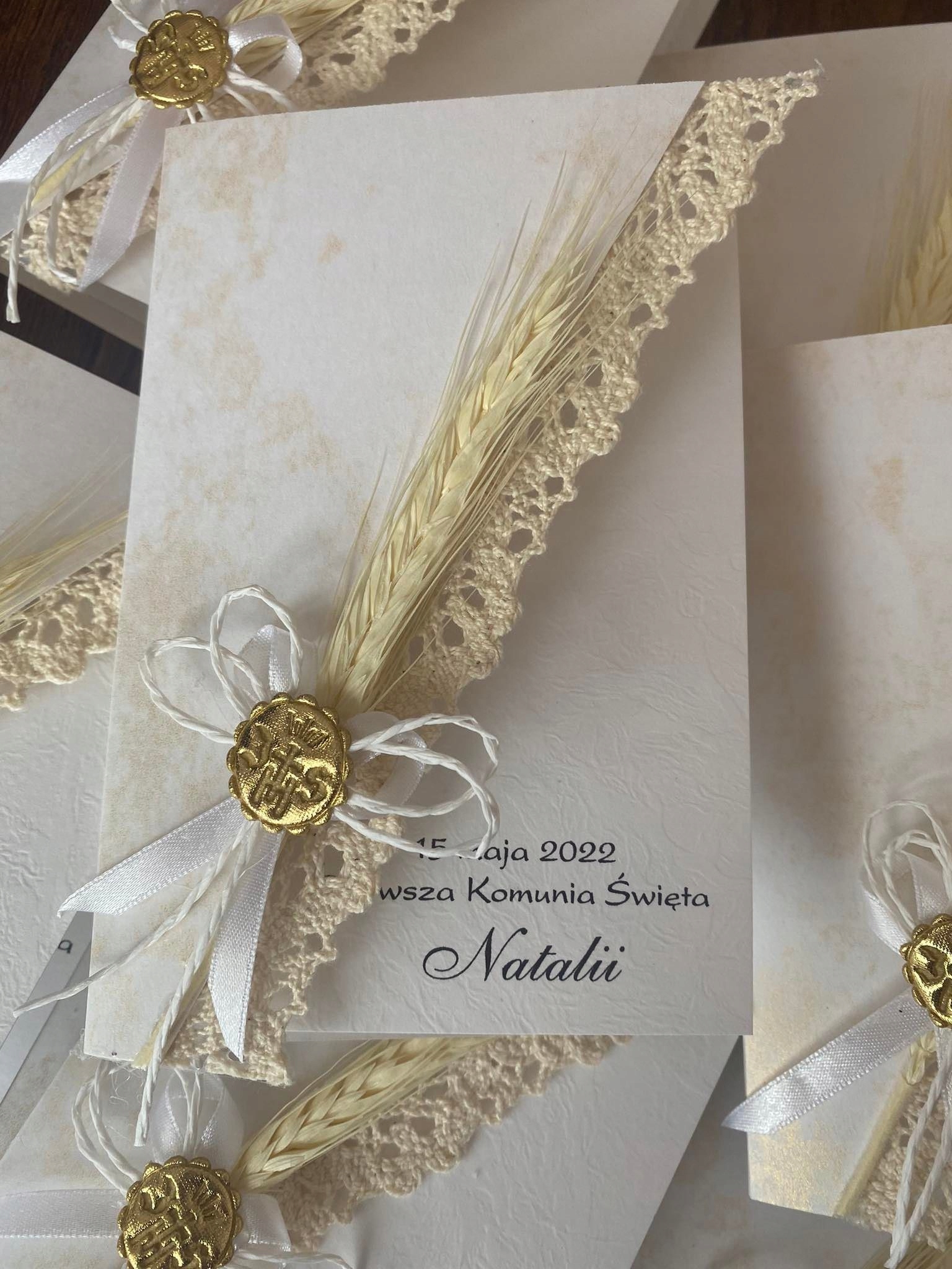 Внешняя часть приглашения украшена натуральным початком кукурузы, кружевом и нежной эмблемой IHS.