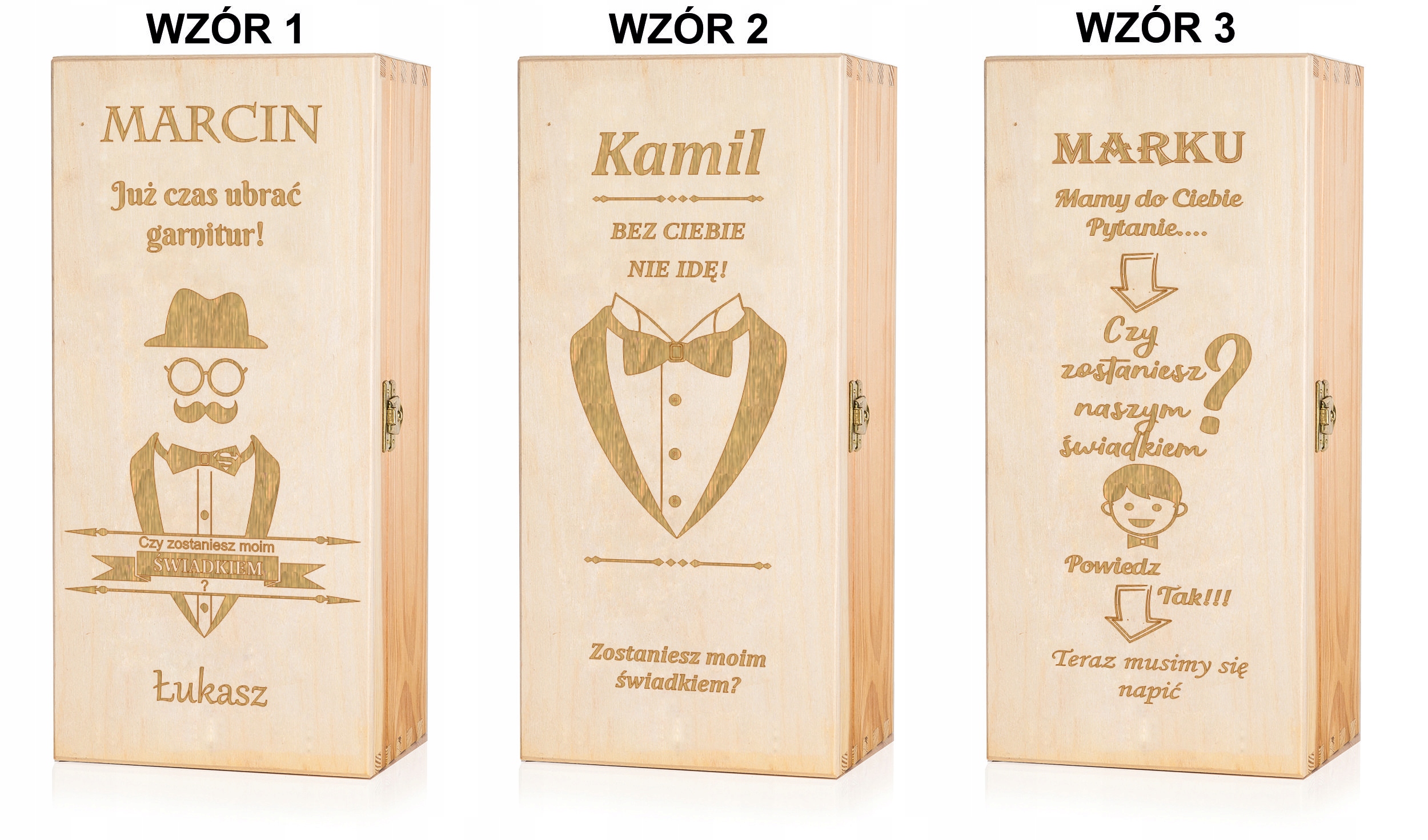 На аукционе ниже мы представляем Вам запрос будущему СВИДЕТЕЛЮ в виде деревянная коробка для виски. Вопрос, заданный в такой форме, обязательно убедит вашего друга выполнить эту важную функцию на вашей церемонии. Удивите своих свидетелей уникальной формой приглашения. Гравировка на деревянной шкатулке, несомненно, станет сувениром на очень долгое время. Этот подарок вызовет улыбку на лице каждого получателя.