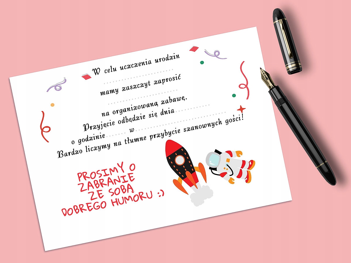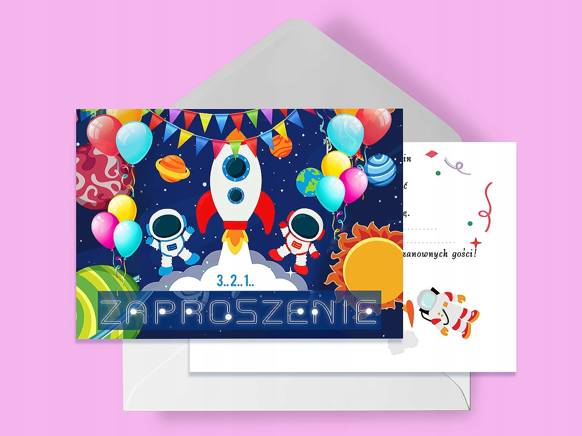 ZAPROSZENIE KOSMOS RAKIETA PLANETY KOSMONAUCI NA URODZINY DZIECKA + KOPERTA