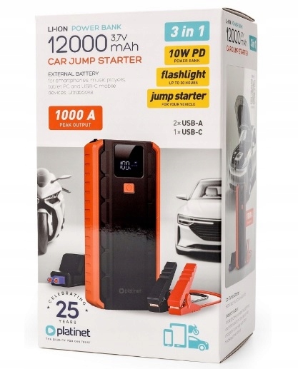 Платиновый стартер - это устройство, которое не только действует как аварийный усилитель батареи. Это также будет полезно ежедневно в качестве мощного банка. Емкость 12 000 мАч, использование 2 USB -порта позволит вам заряжать два устройства одновременно. Банк мощности может быть источником энергии не только для небольшого электронного оборудования, такого как смартфон или динамики, но также может использоваться для зарядки ноутбуков.