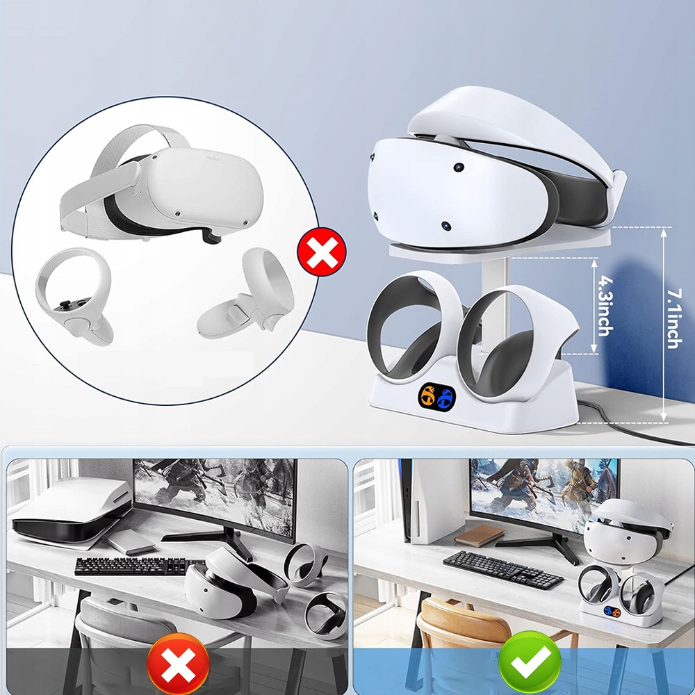 - Он может быть надежно прикреплен к вертикальной подставке и не будет опрокинут домашними кошками. или маленькие дети. Вы можете хранить гарнитуру и контроллеры в одном месте, чтобы поддерживать порядок в игровой зоне.
