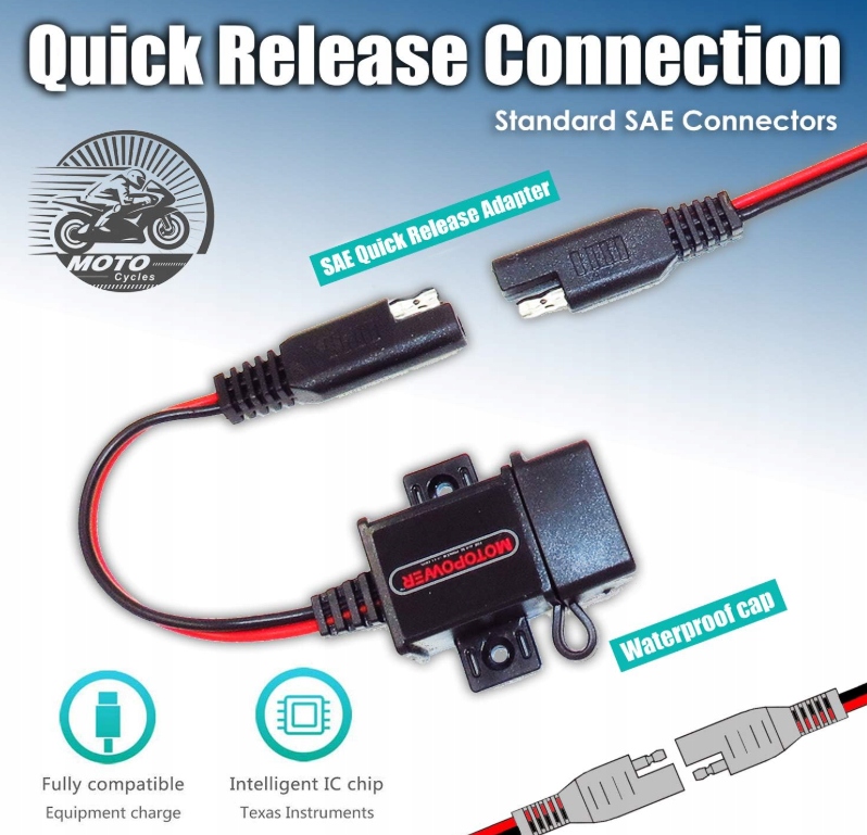 ➡️ Универсальное использование – Входное напряжение: 12–24 В; Выход: 5 В, 3,1 А. Заряжает практически любой телефон, планшет, GPS, камеру и т. д. Благодаря быстрому разъему SAE зарядное устройство может работать напрямую с существующими вилками SAE на мотоциклах. Входящий в комплект кабель SAE с предохранителем на 7,5 А для кольцевой клеммы позволяет удобно заряжать аккумулятор с помощью зарядных устройств или капельных зарядных устройств.
