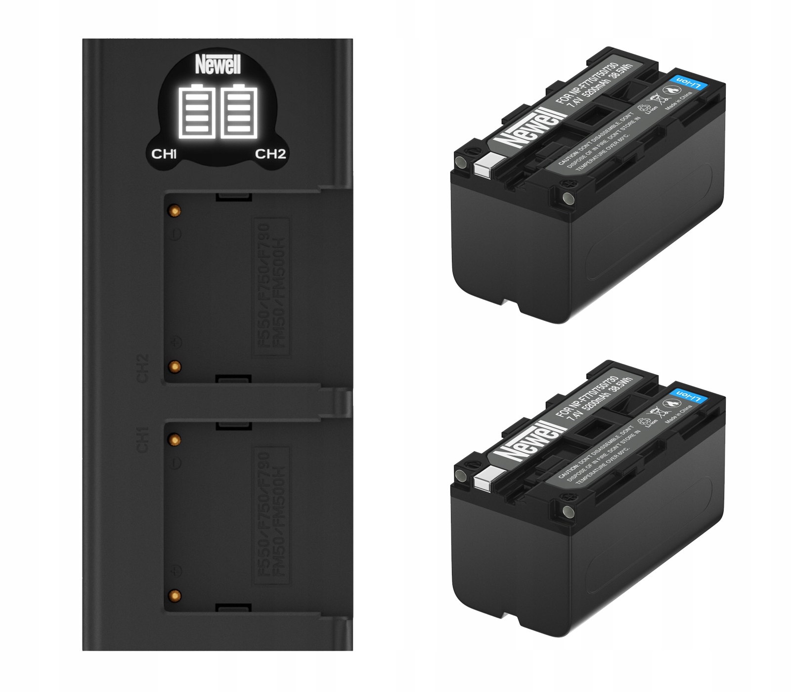 В комплект входит Двухканальное зарядное устройство Newell для аккумуляторов NP-F770 для Sony и два аккумулятора Newell NP-F770 для Sony.
