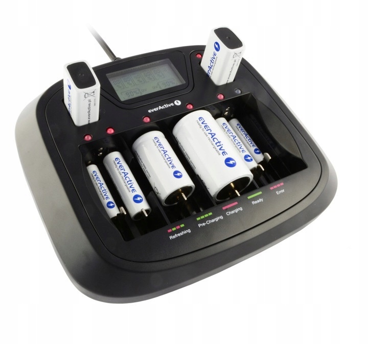 - Цифровой ЖК-дисплей, показывающий примерный процент заряда каждого элемента в отдельности, разноцветные светодиоды указывают текущий режим работы, - высокое качество, гарантированное брендом everActive.