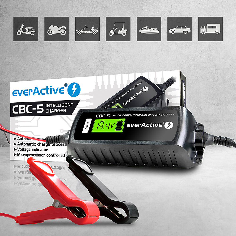 EverActive CBC5 — универсальное зарядное устройство для аккумуляторов напряжением 6 В/12 В, популярных в автомобильной и промышленной сферах. Поддерживает большинство автомобильных аккумуляторов, гелевых аккумуляторов, аккумуляторов AGM емкостью 1,2–120 Ач. Это универсальное зарядное устройство представляет собой так называемое интеллектуальный выпрямитель, полностью автоматический и простой в использовании.