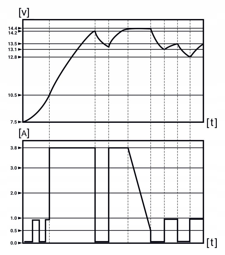 - Зарядный ток (эффективный): регулируемый 0,8/3,8 [А] для 12 В
