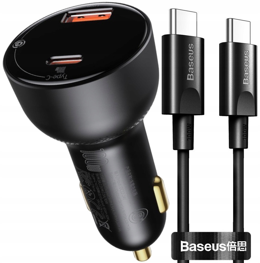 Умное автомобильное зарядное устройство Baseus с разъемами USB + USB-C и черным кабелем USB-C длиной 100 см