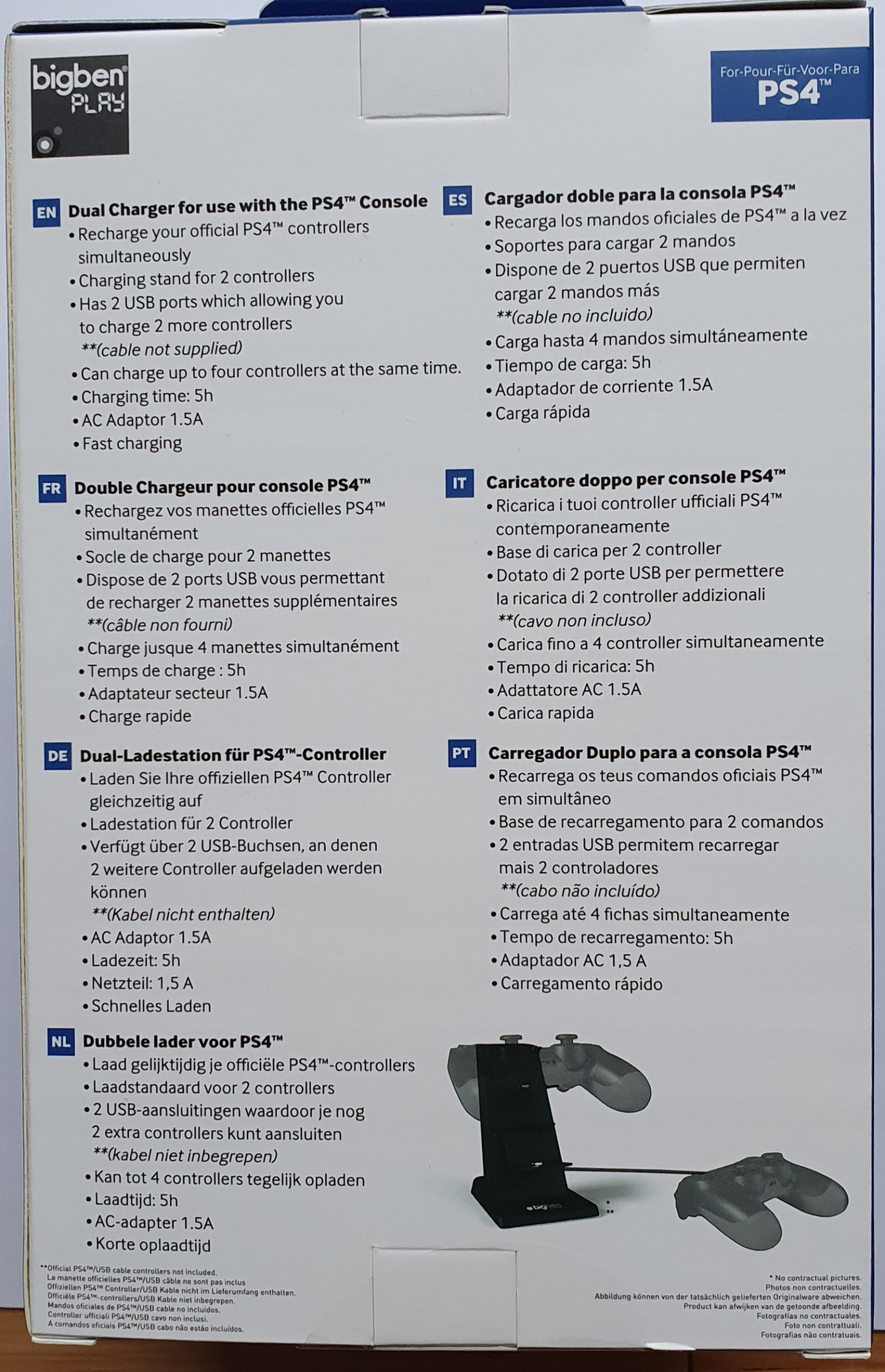 Просматривая «Зарядний пристрій BIGBEN для PS4 2 + 2 колодки з блоком живлення», вы можете быть уверены, что данный товар из каталога «Проводка» будет доставлен из Польши и проверен на целостность. В цене товара, указанной на сайте, учтена доставка из Польши. Внимание!!! Товары для Евросоюза, согласно законодательству стран Евросоюза, могут отличаться упаковкой или наполнением.