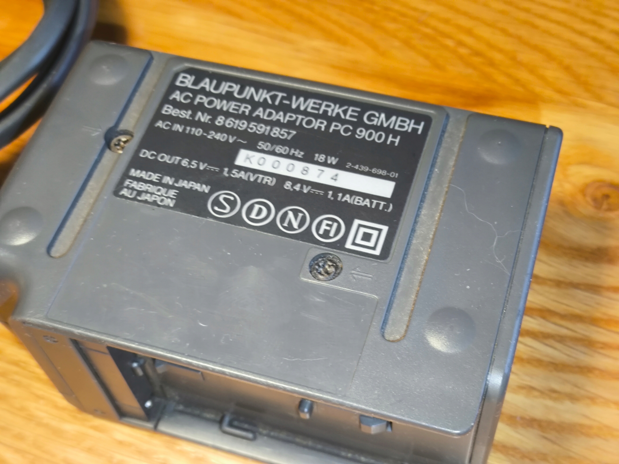Оригинальное зарядное устройство/адаптер Blaupunkt AC Power Adaptor PC-900H, производства Blaupunkt-Werke GmbH (Сделано в Японии). Устройство изначально предназначалось для видеокамер Blaupunkt рубежа 1980-1990-х годов, в частности модели Blaupunkt CC-900H (VHS-C).
