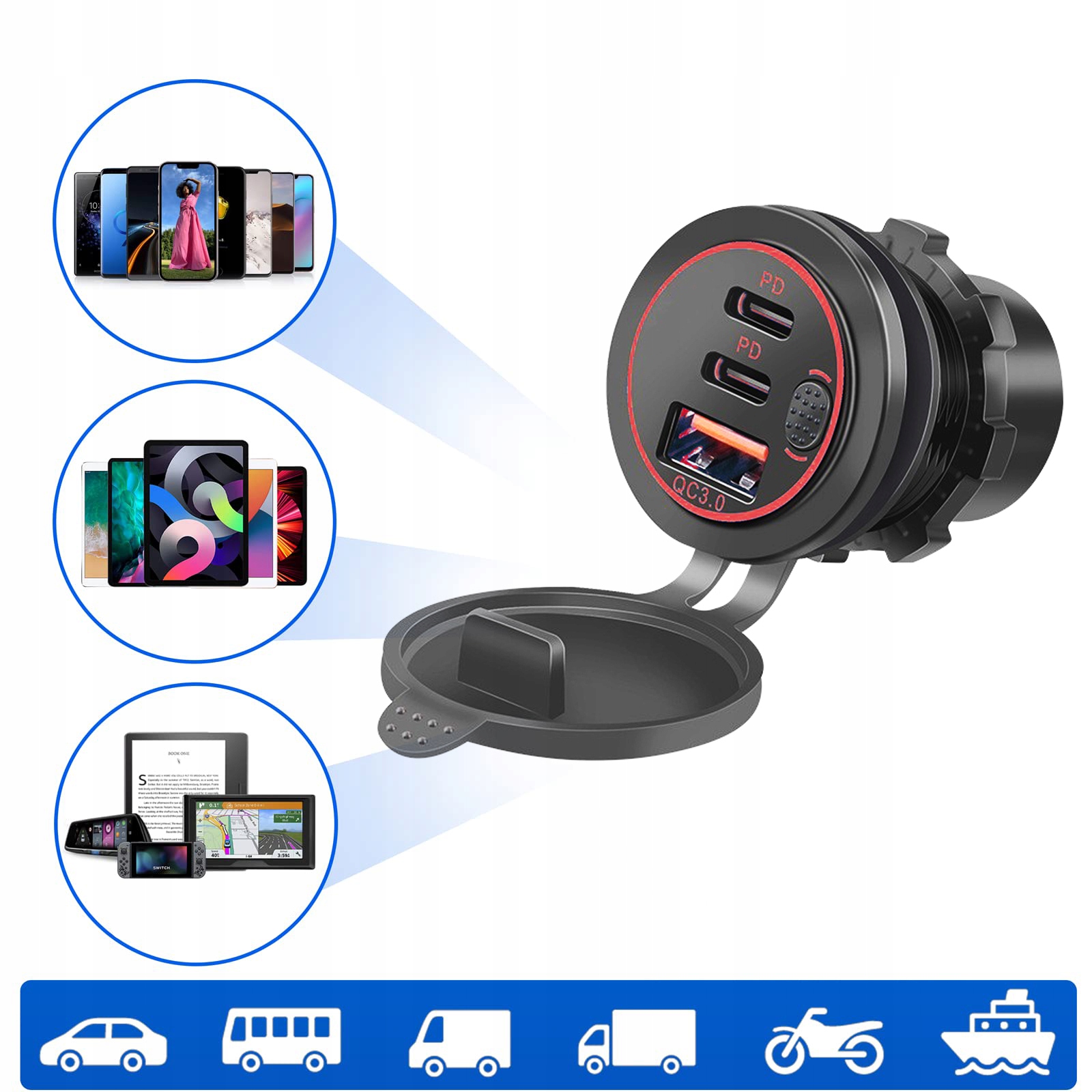 Автомобильное зарядное устройство USB-C мощностью 58 Вт, два выхода USB-C PD3.0 мощностью 20 Вт и один порт Quick Charge 3.0 мощностью 18 Вт.