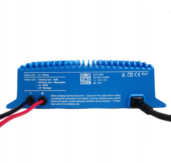Зарядное устройство Blue Smart IP67 с одним выходом и встроенным модулем Bluetooth устойчиво к повреждениям, вызванным водой, маслом или грязью. Корпус изготовлен из литого алюминия, а электронные схемы залиты смолой.