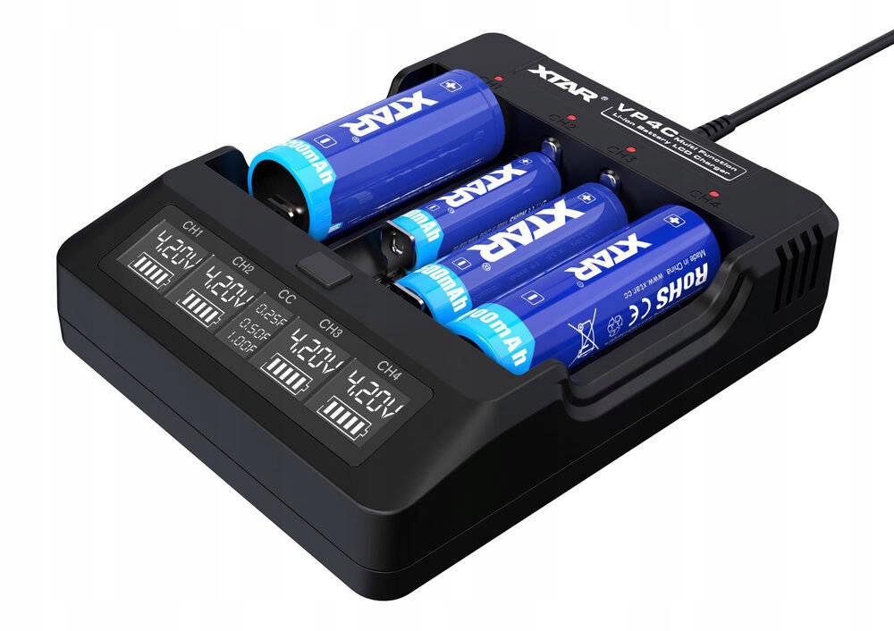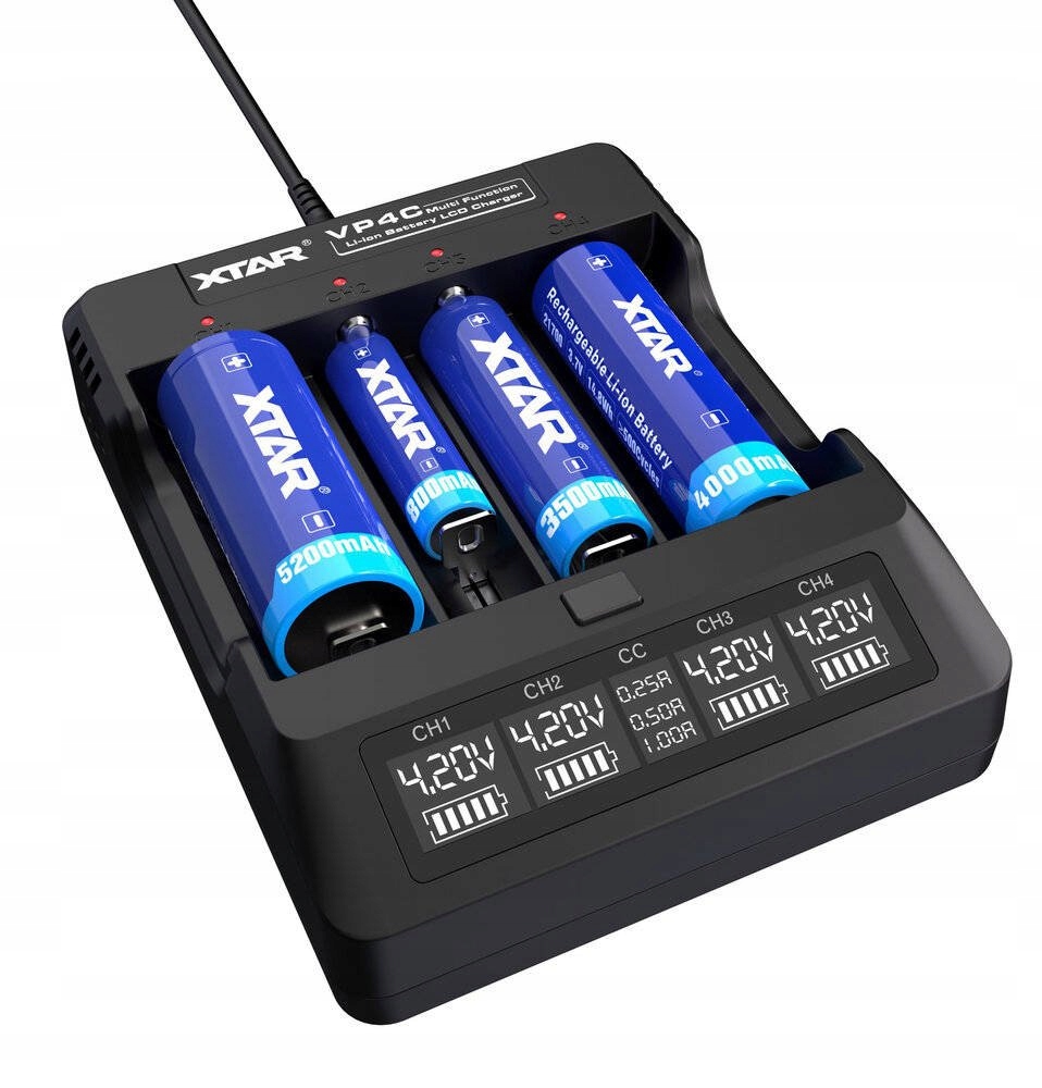 Профессиональное зарядное устройство для процессора с трехступенчатым процессом зарядки TC/CC/CV. Xtar VP4 заряжает стандартные литий-ионные элементы напряжением 3,6/3,7 В типоразмеров 10440, 14500, 14650, 16340, 17500, 17670, 18350, 18500, 18650, 18700, 20700, 21700, 22650, 25500, 26. 650, 32650. Батарейки самых больших размеров , то есть 22650, 26650 и 32650, можно заряжать только в двух крайних каналах.