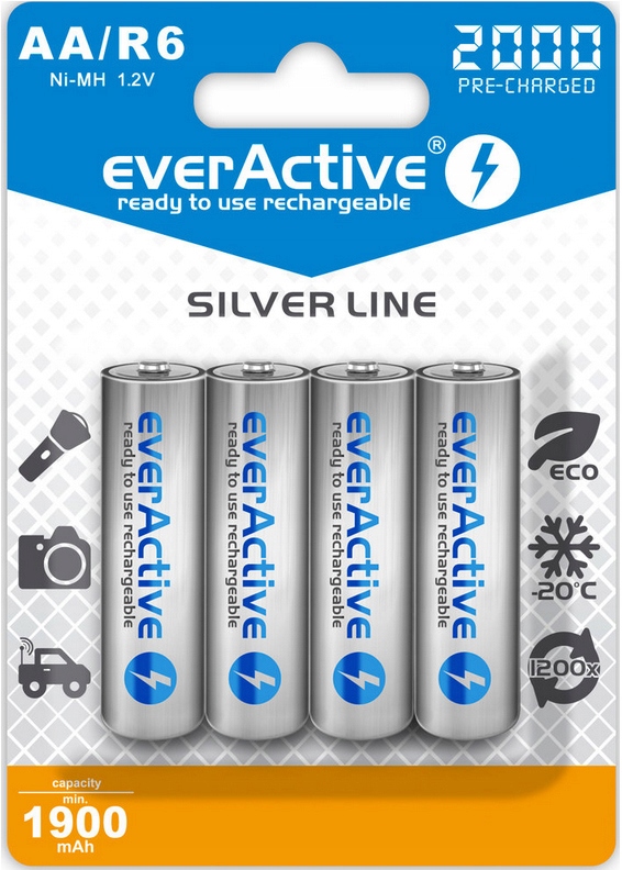 4 инновационных аккумулятора R6 AA 2000 мАч everActive, выполненных по технологии «готов к использованию».