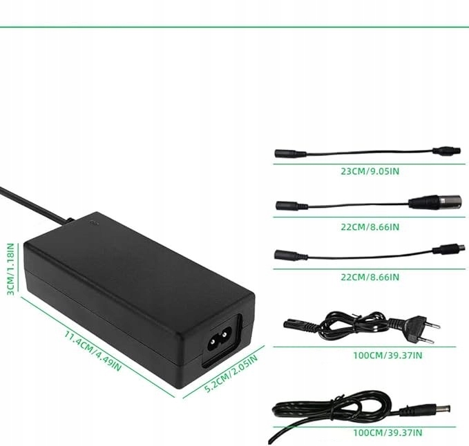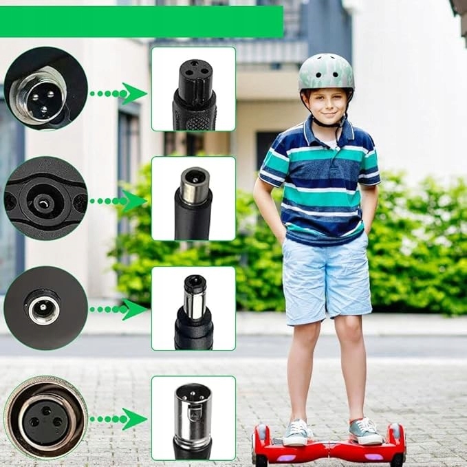 - Это универсальное зарядное устройство для электросамокатов разработано с учетом максимальной совместимости. Он оснащен четырьмя (комплект из 6 в зависимости от конфигурации) различными типами разъемов, что делает его пригодным для электросамокатов, самокатов постоянного тока, одноколесных велосипедов и ховербордов. Поддерживает популярные вилки, такие как: XIAOMI, DC 5,5 × 2,5 мм, авиационная вилка 9 мм, авиационная вилка 12 мм, головка XLR и штыревая головка. Диапазон входного напряжения составляет 100-240 В переменного тока, 50/60 Гц, 2 А, а на выходе — стабильные 42 В 2 А, что обеспечивает безопасную и эффективную зарядку многих моделей электромобилей.