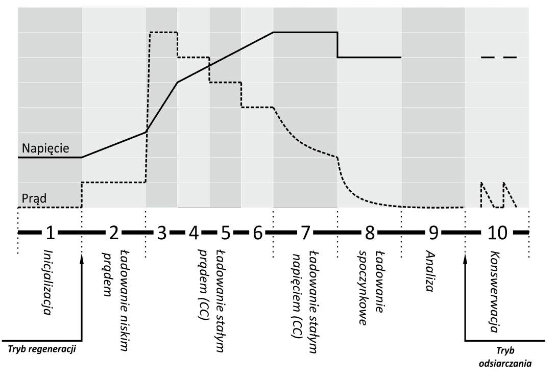 1. Инициализация: проверяет состояние батареи, чтобы определить подходящий режим зарядки. Если аккумулятор глубоко разряжен, устройство начнет рекуперативную зарядку.