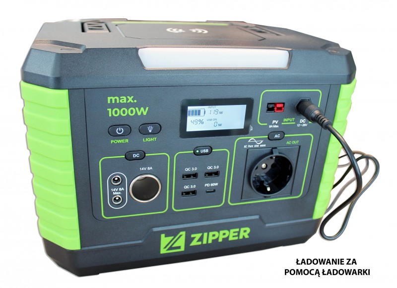 Zipper ZI-PS1000 — портативная электростанция для питания приборов даже при отсутствии доступа к электрической сети. Заряжается от солнечной панели, блока питания и автомобильного прикуривателя. Подходит для зарядки ноутбука, смартфона, GoPro и т.п.