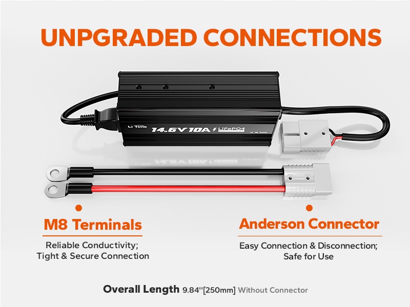 Зарядное устройство для литий-ионных аккумуляторов LiTime 12 В обеспечивает пользователям быструю зарядку и более безопасный процесс зарядки благодаря разъему Anderson на 50 А и клеммам M8. Полная зарядка литиевой батареи 12 В, 50 Ач занимает 5 часов.