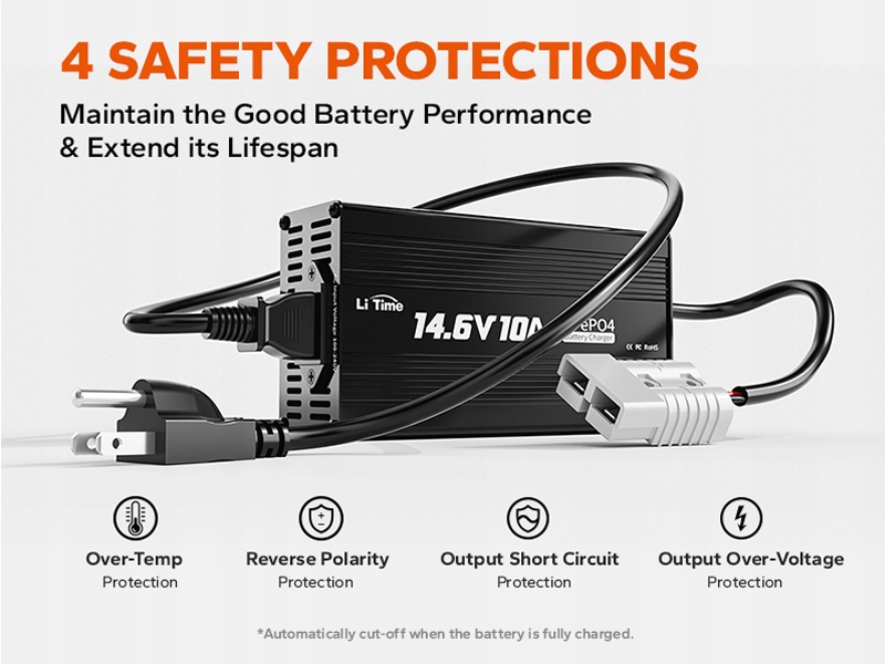 Зарядное устройство LiTime 12V LiFePO4 может защитить и контролировать вашу батарею в любое время. Обеспечивает 100% надежную защиту от перегрева, обратной полярности, выходного короткого замыкания и выходного перенапряжения, а также отображает состояние зарядки аккумулятора в режиме реального времени с помощью светодиодных индикаторов.