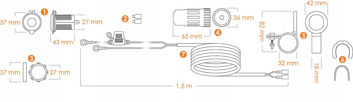 В комплект с USB-розеткой входит кабель питания толщиной 6 мм и длиной 1,5 м. Длина кабеля подобрана оптимально, чтобы его можно было провести максимально удобно и незаметно, от аккумулятора до самой розетки. На одной стороне кабеля имеются проушины, а на другой - плоские гнездовые разъемы, подходящие для разъема USB.