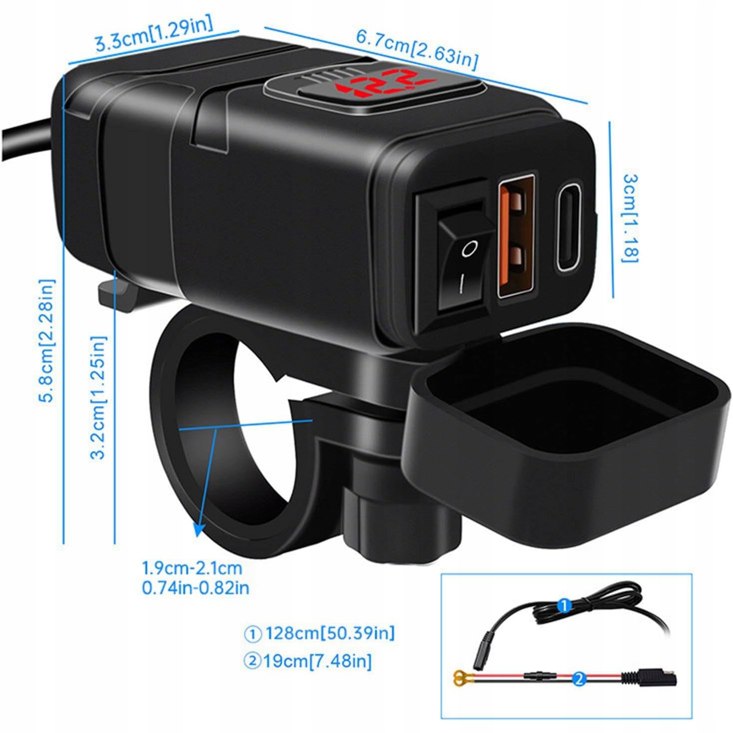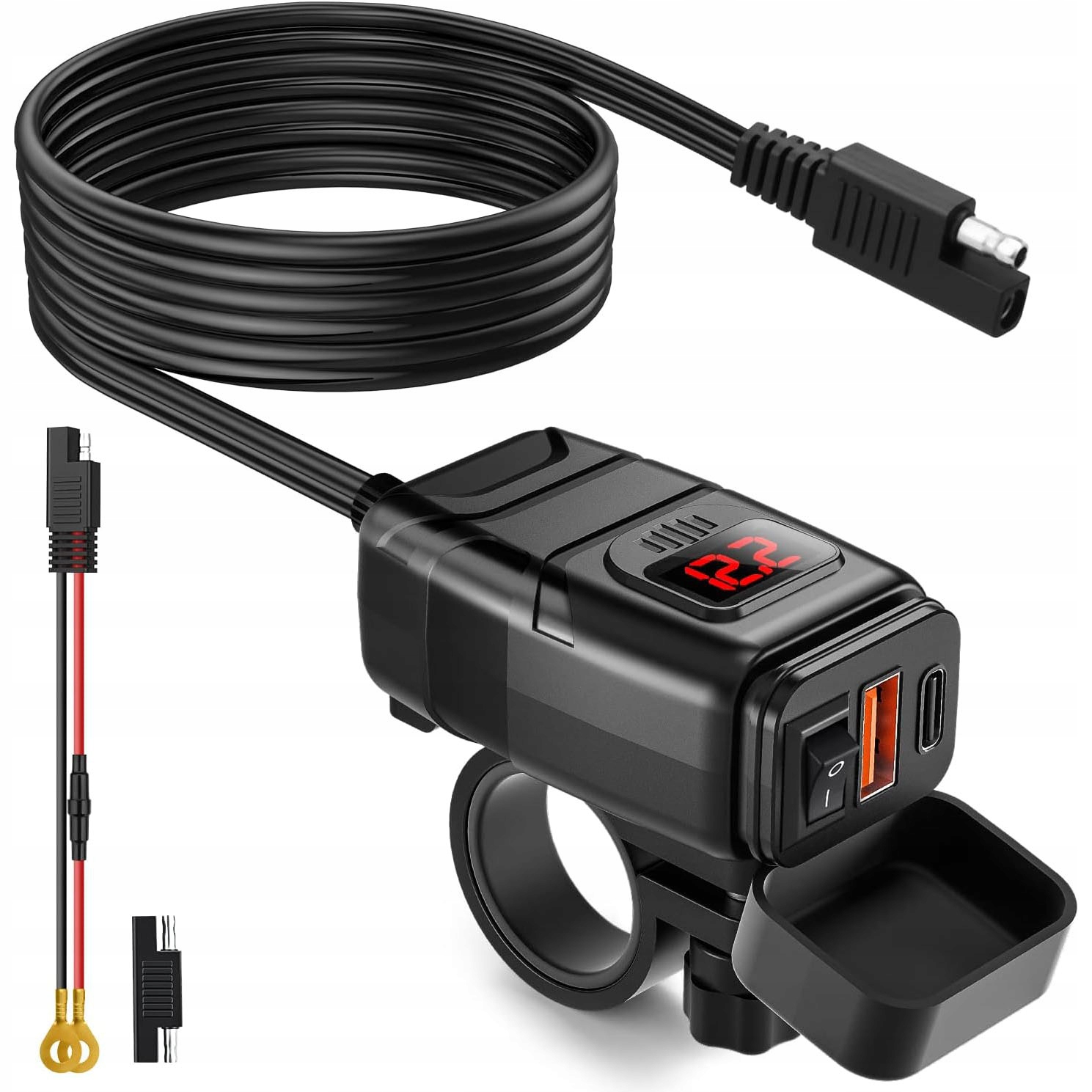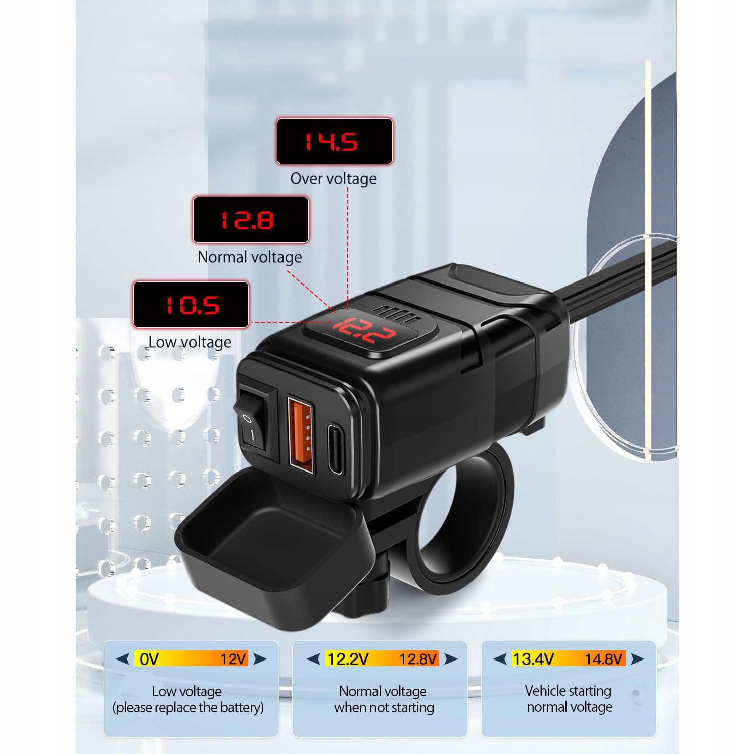 ЗАРЯДНОЕ УСТРОЙСТВО ДЛЯ МОТОЦИКЛА СО СВЕТОДИОДНЫМ ВОЛЬТМЕТРОМ 48ВТ QC3.0 USB И USB-C