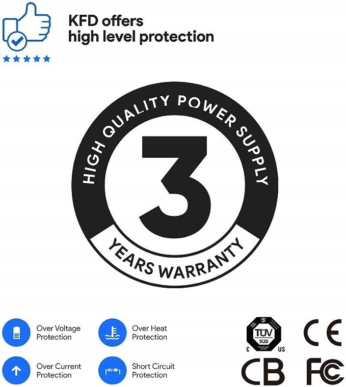 Продукция сертифицирована TÜV, GS, CB, CE, ROHS, FCC, REACH. Продукция KFD изготовлена из высококачественных материалов. Он имеет защиту от перегрева, защиту от перенапряжения, защиту от перегрева и защиту от перегрузки по току. 100% совместимость с оригиналами.