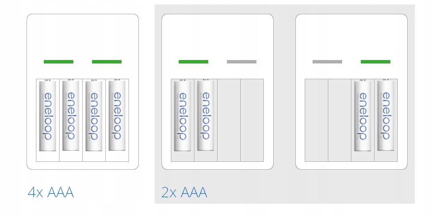 Для вашего удобства зарядное устройство продается в комплекте с популярными аккумуляторными батареями Panasonic Eneloop R6/AA 2000мАч Ni-MH BK- 3MCDE. Батареи можно заряжать и использовать несколько раз, а серия Eneloop позволяет это делать до 2100 раз! Что еще более важно, они сохраняют до 70% своей энергии даже через 10 лет, поэтому могут лежать неиспользованными в ящике стола, не опасаясь значительной потери заряженной энергии. Также у них нет эффекта памяти – их можно подзарядить в любой момент, не беспокоясь о потере емкости аккумулятора. Eneloop так же просты в использовании, как и аккумуляторы, а также экологичны и экономичны, как аккумуляторные батареи.