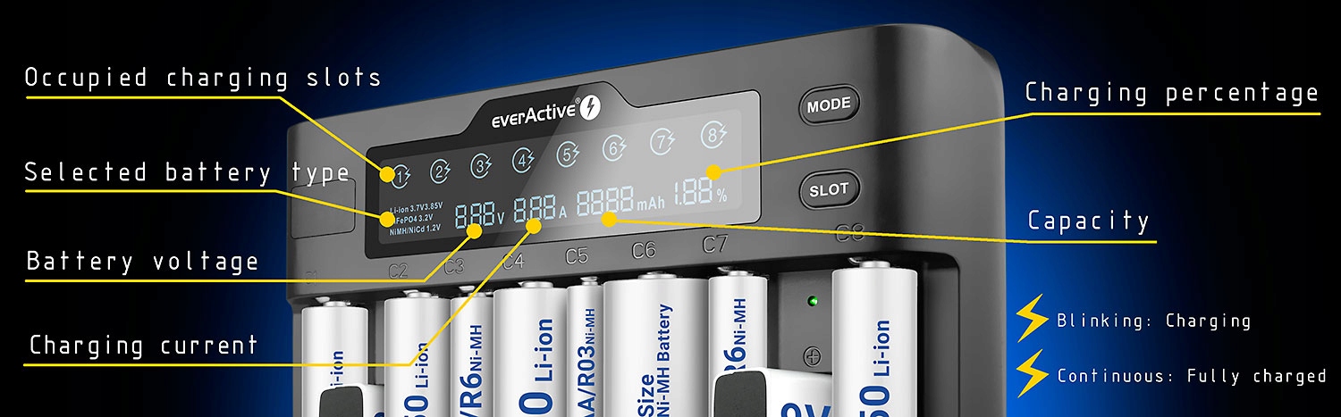 - Регулируется - 200 мА - 2000 мА для канала / слота для li -ition / li -fepo4 (2000 мА только для каналов 1 и 8)