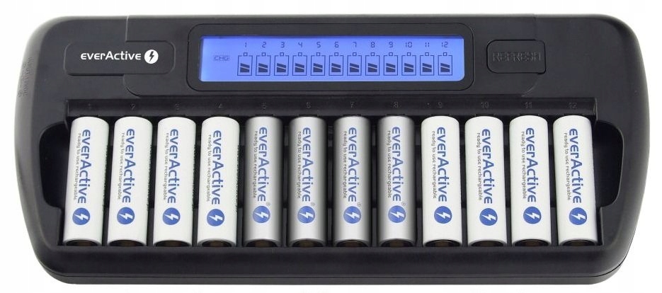 Зарядное устройство everActive NC 1200 имеет до 12 независимых каналов зарядки для Ni-MH аккумуляторов типоразмеров R6/AA или R03/AAA. каждая ячейка тарифицируется индивидуально. Это новинка на польском рынке, использующая самые передовые технологии.