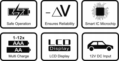 - Зарядный ток AA: 12x 500 мА макс.; AAA: 12x 250 мА макс.