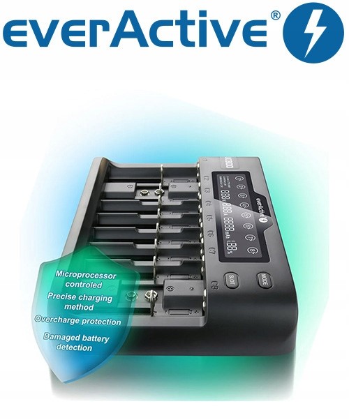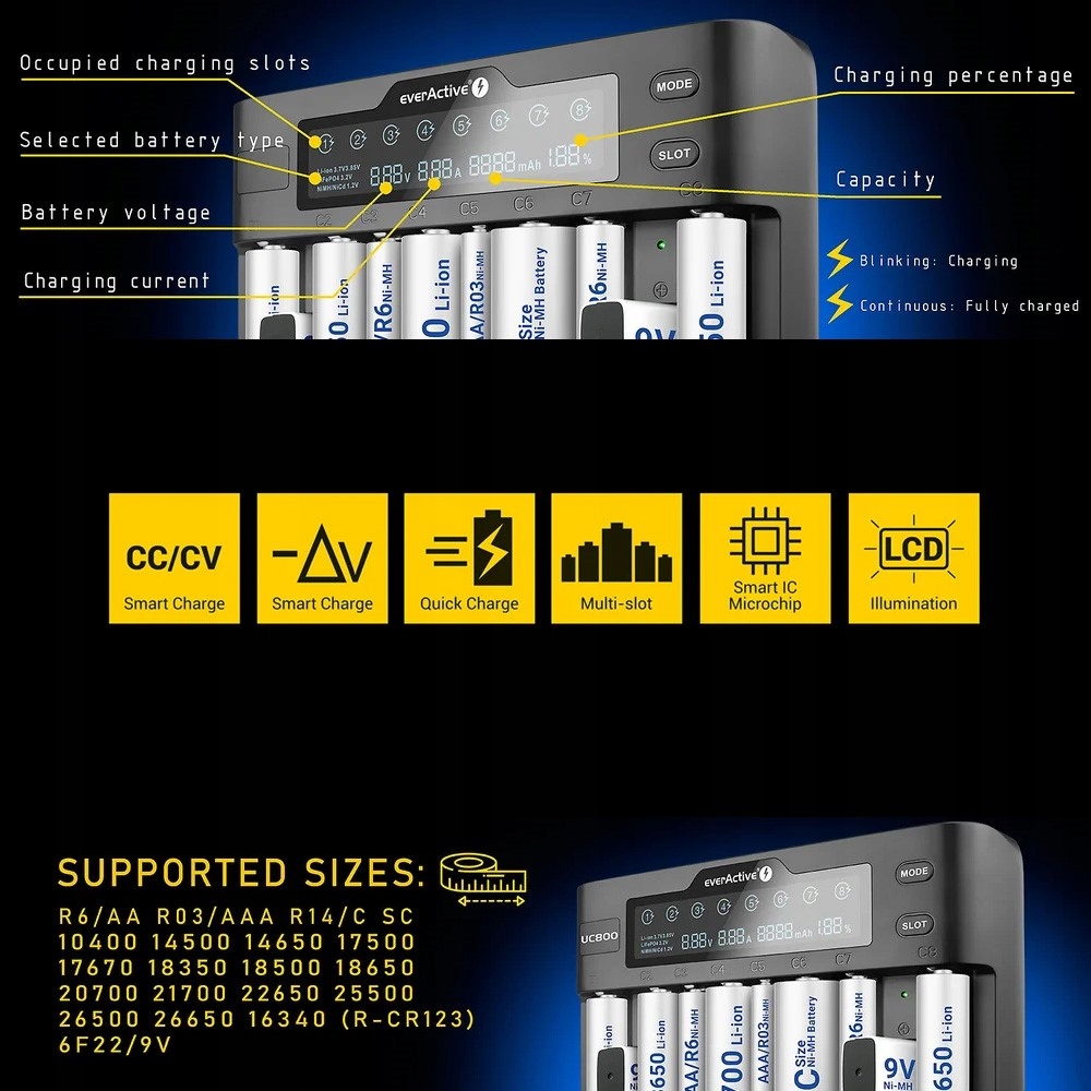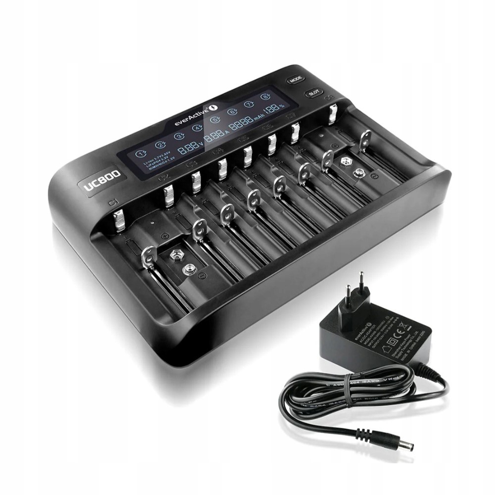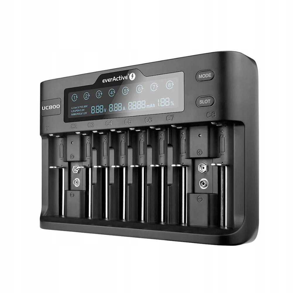 EverActive UC800 — многоканальное универсальное зарядное устройство, имеющее до десяти независимых каналов! Восемь каналов используются для зарядки цилиндрических Ni-MH, Li-ion, Li-HV и Li-FePO4 аккумуляторов. Остальные два канала используются для зарядки аккумуляторов напряжением 9 В (6F22).