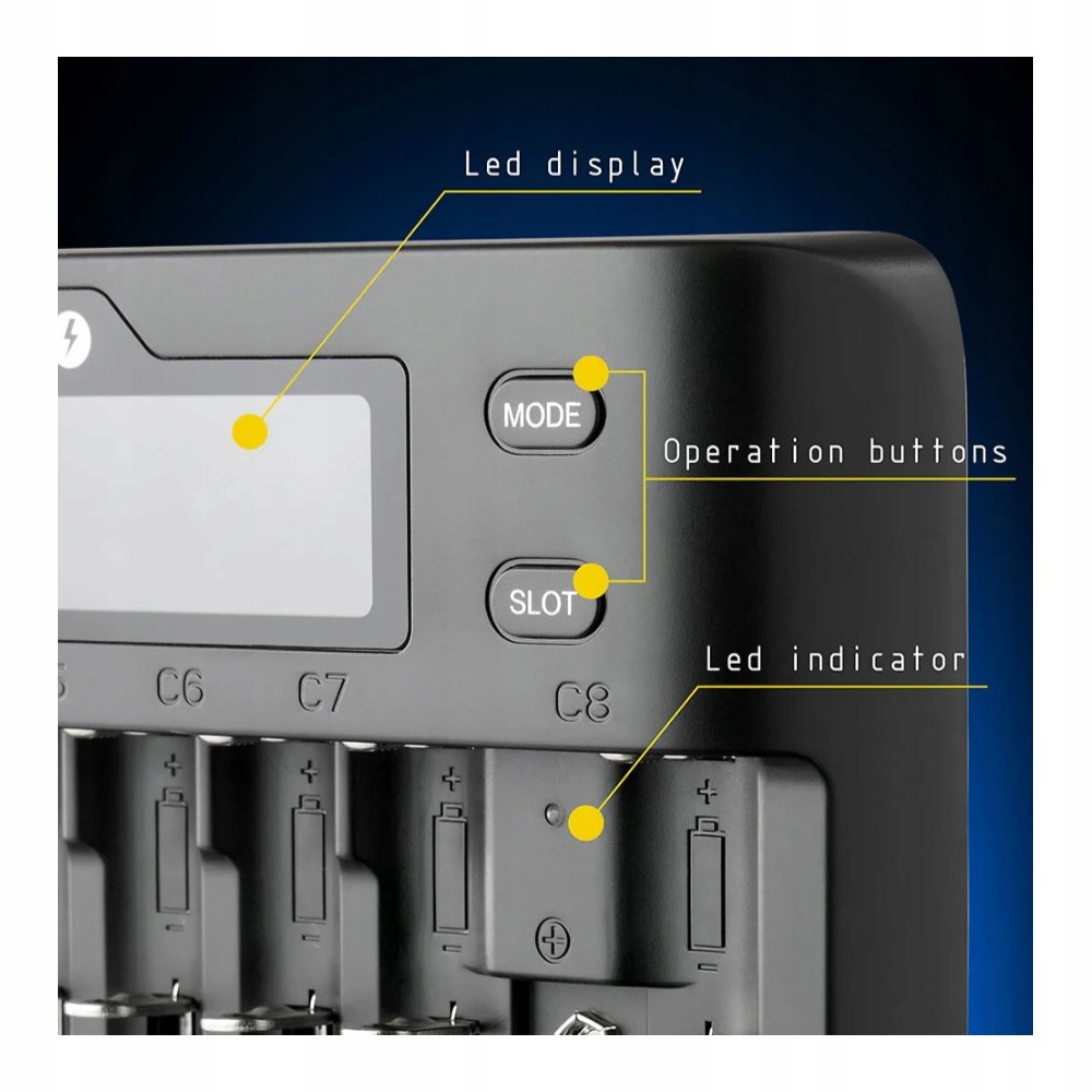- регулируемый зарядный ток для литиевых элементов: 8x 0,8А, 6x 1A, 2x 2A max, для Ni-MH есть зарядные токи на выбор: 8x 0,2/0,5/0,8/1А, для аккумуляторов 6F22/9В зарядный ток составляет 60мА,