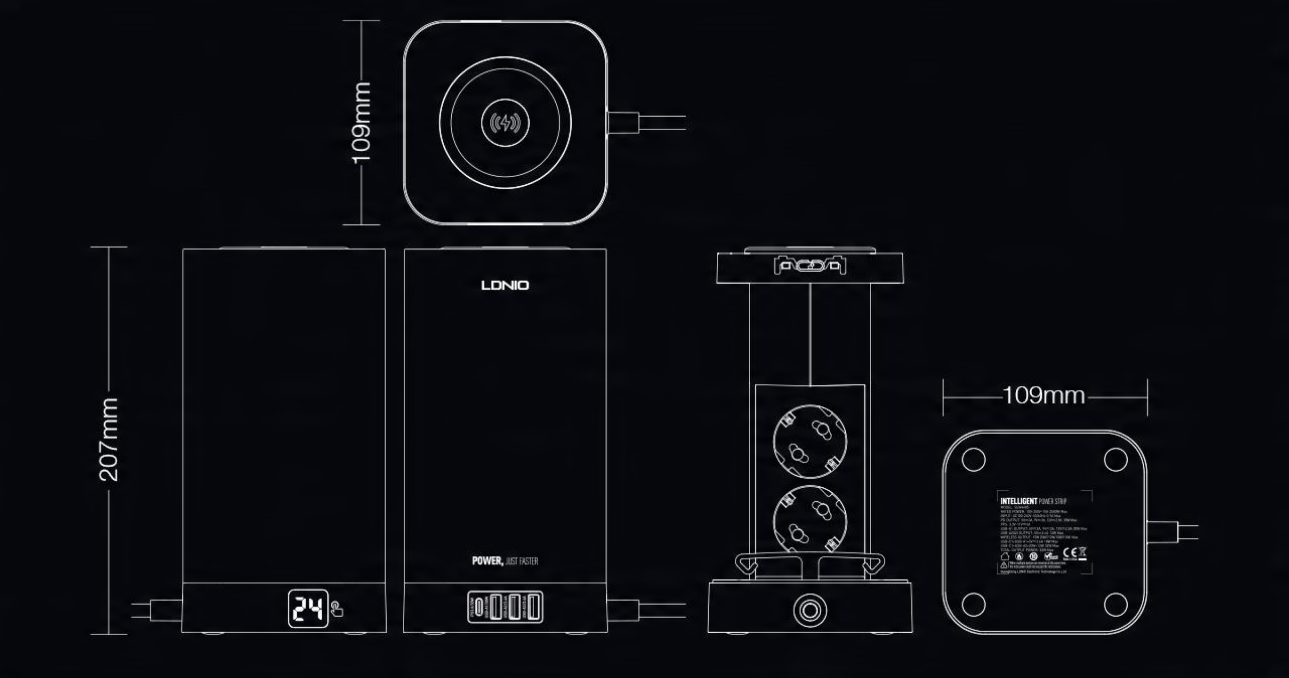 ⭐ Оригинальное супер быстрое зарядное устройство LDNO STELING Strip: USB QC3.0 + USB 2.4A + USB Type C Type 20W + Беспроводная зарядка QI 15W + 5 сокетов 230 В! ⭐