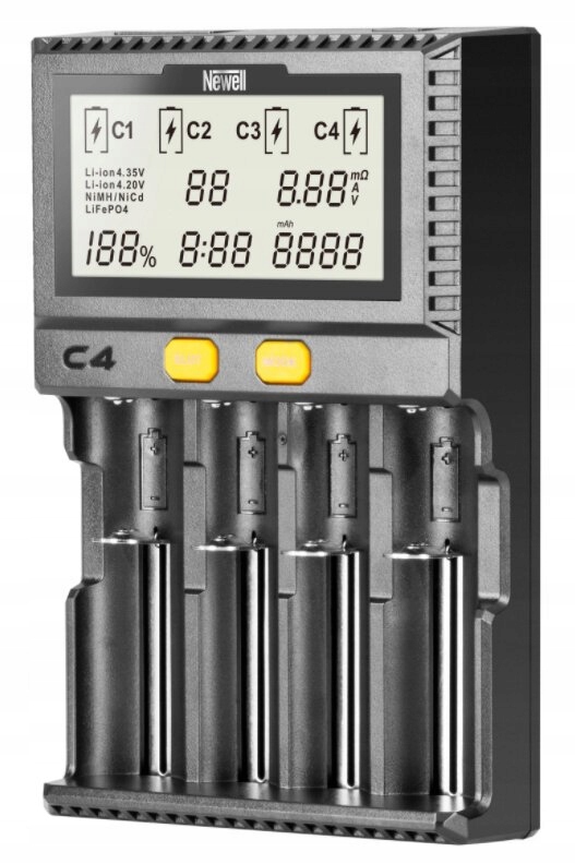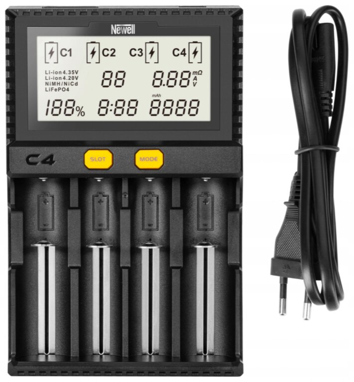 Newell C4 Supra — универсальное зарядное устройство, совместимое с большинством цилиндрических аккумуляторов, доступных в продаже. На ЖК-дисплее отображается напряжение, ток, время зарядки, внутреннее сопротивление и процент заряда элемента – все это позволяет легко определять параметры и состояние процесса. Специально разработанный корпус позволяет одновременно заряжать даже самые большие аккумуляторы (типа С или 22650) по всем четырем каналам одновременно.
