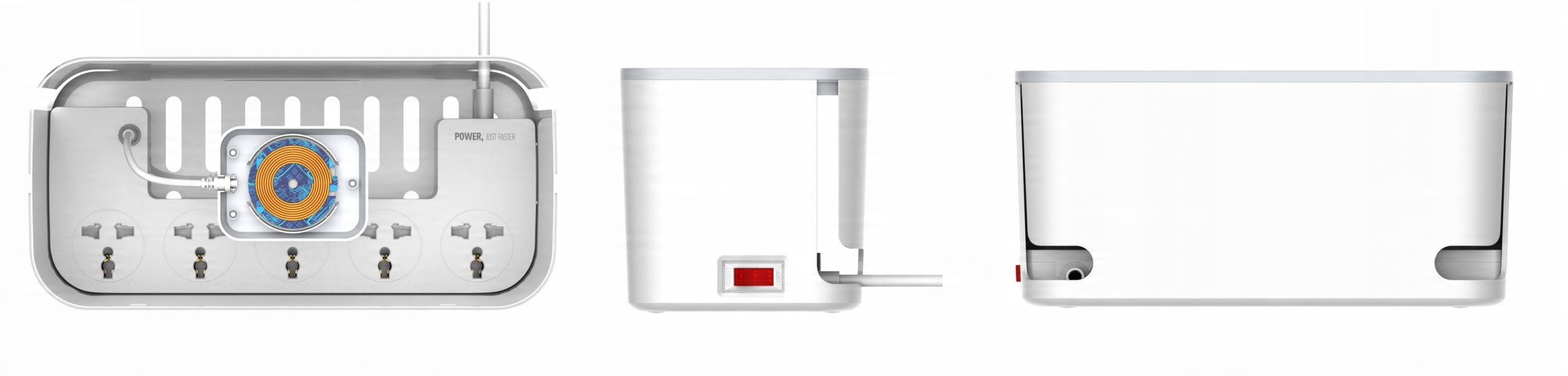 Новейшая модель зарядного устройства, сочетающая в себе удлинитель 230 В, сетевое зарядное устройство USB и беспроводную индуктивную зарядку.