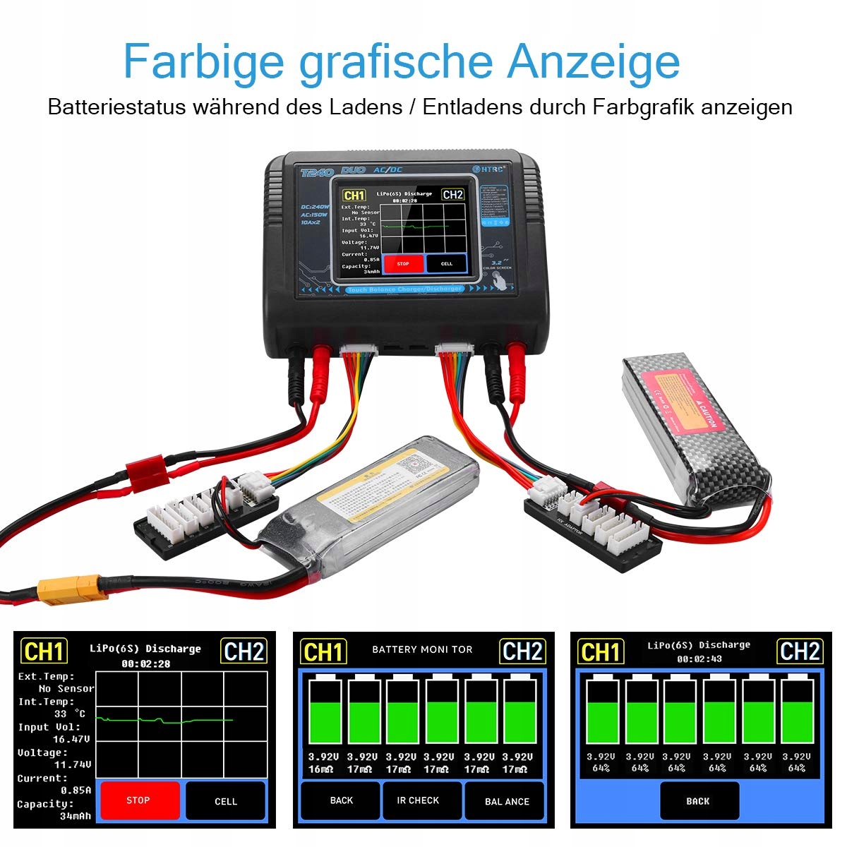 【Простота в использовании】 3,2-дюймовый цветной сенсорный ЖК-экран позволяет легко управлять зарядным устройством и переключаться между двумя режимами. каналы. Он обеспечивает прозрачное состояние зарядки в реальном времени с цифровой графикой, поэтому вы можете полностью контролировать процесс зарядки. Встроенный эффективный вентилятор обеспечивает хороший отвод тепла. (Обратите внимание, что вентилятор издает шум во время работы зарядного устройства.)