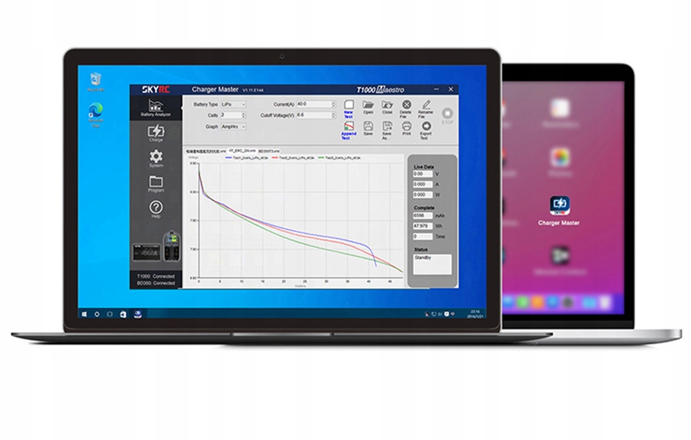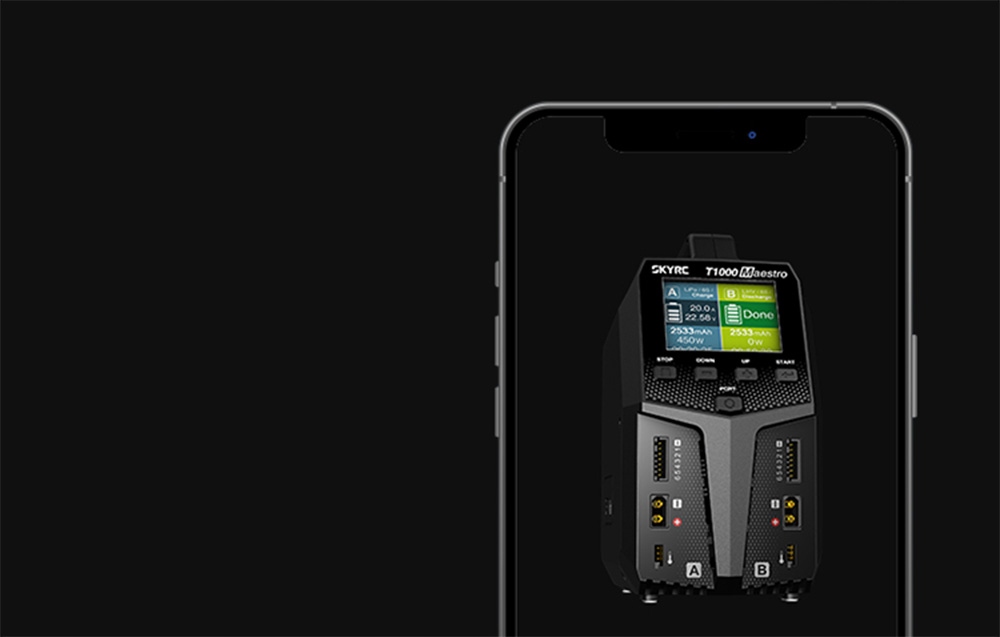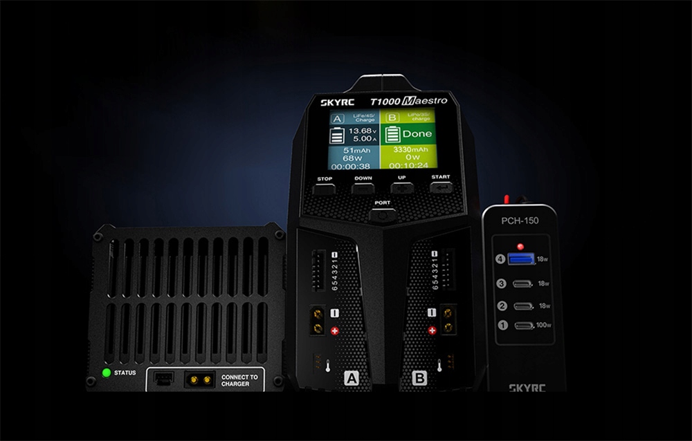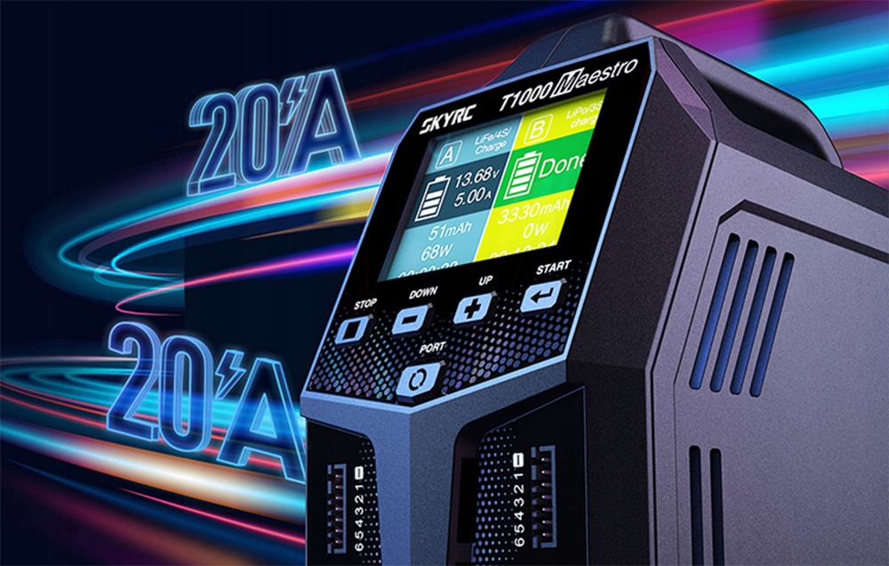 SkyRC T1000 Maestro — это новое невероятно мощное зарядное устройство для радиоуправляемых моделей мощностью до 450 Вт (переменный ток) или даже 1000 Вт (постоянный ток). Он использует усовершенствованное ядро Arm Cortex-M4 и оснащен цветным дисплеем, который предоставит вам самую важную информацию о его работе. Он позволяет использовать 2 порта одновременно, и его транспортировка не будет для вас проблемой. Также доступно специальное программное обеспечение Charger Master, расширяющее возможности.